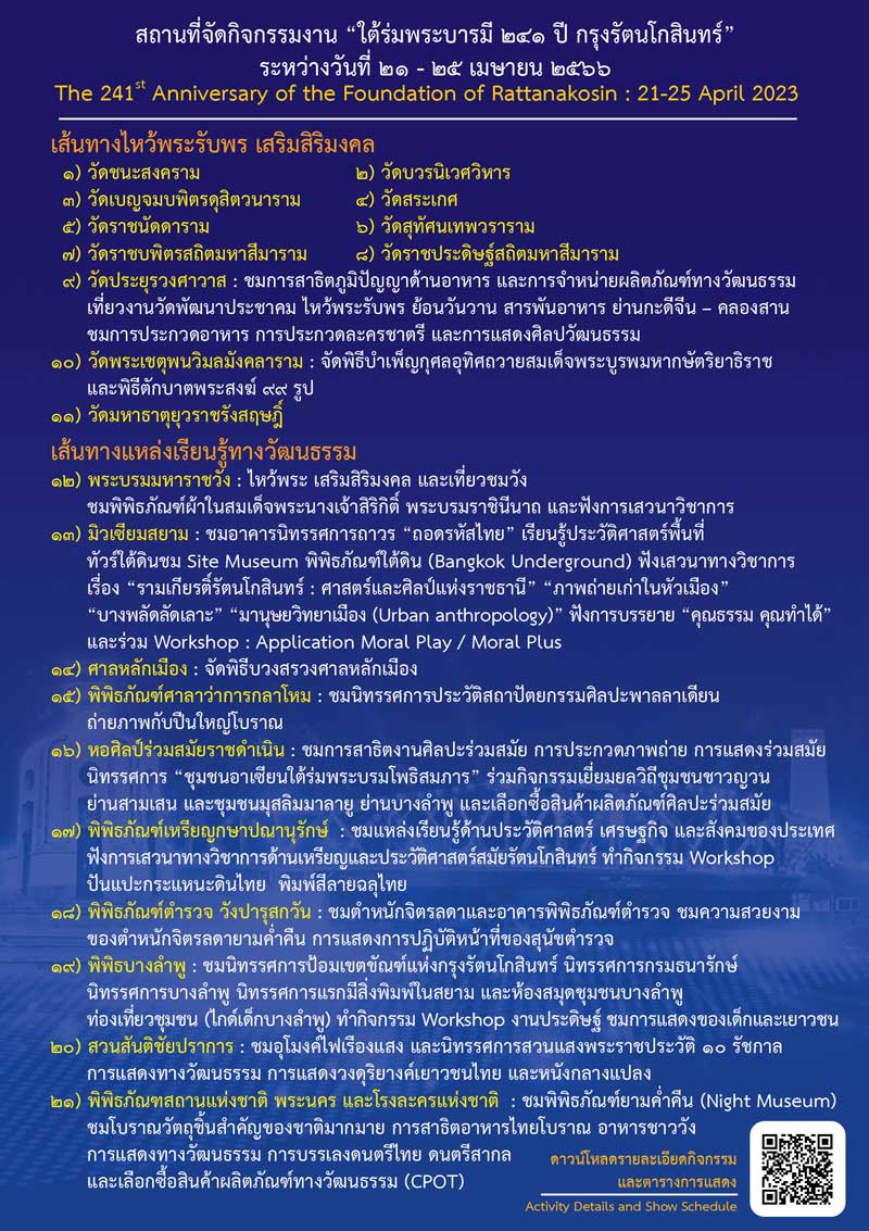 กระทรวงวัฒนธรรม ขอเชิญชวนเที่ยวงานใต้ร่มพระบารมี ๒๔๑ ปี กรุงรัตนโกสินทร์ ไหว้พระ เที่ยววัด ยลวัง สัมผัสพิพิธภัณฑ์ยามค่ำ ชมการแสดงศิลปวัฒนธรรมที่หาชมได้ยาก เลือกซื้อสินค้าผลิตภัณฑ์วัฒนธรรมไทย CPOT ระหว่างวันที่ ๒๑ - ๒๕ เมษายน ๒๕๖๖ ณ พิพิธภัณฑสถานแห่งชาติ พระนคร โรงละครแห่งชาติ และ ๒๑ แหล่งเรียนรู้รอบเกาะรัตนโกสินทร์ (สวนสันติชัยปราการ ๒๑ เมษายน - ๗ พฤษภาคม ๒๕๖๖ )
