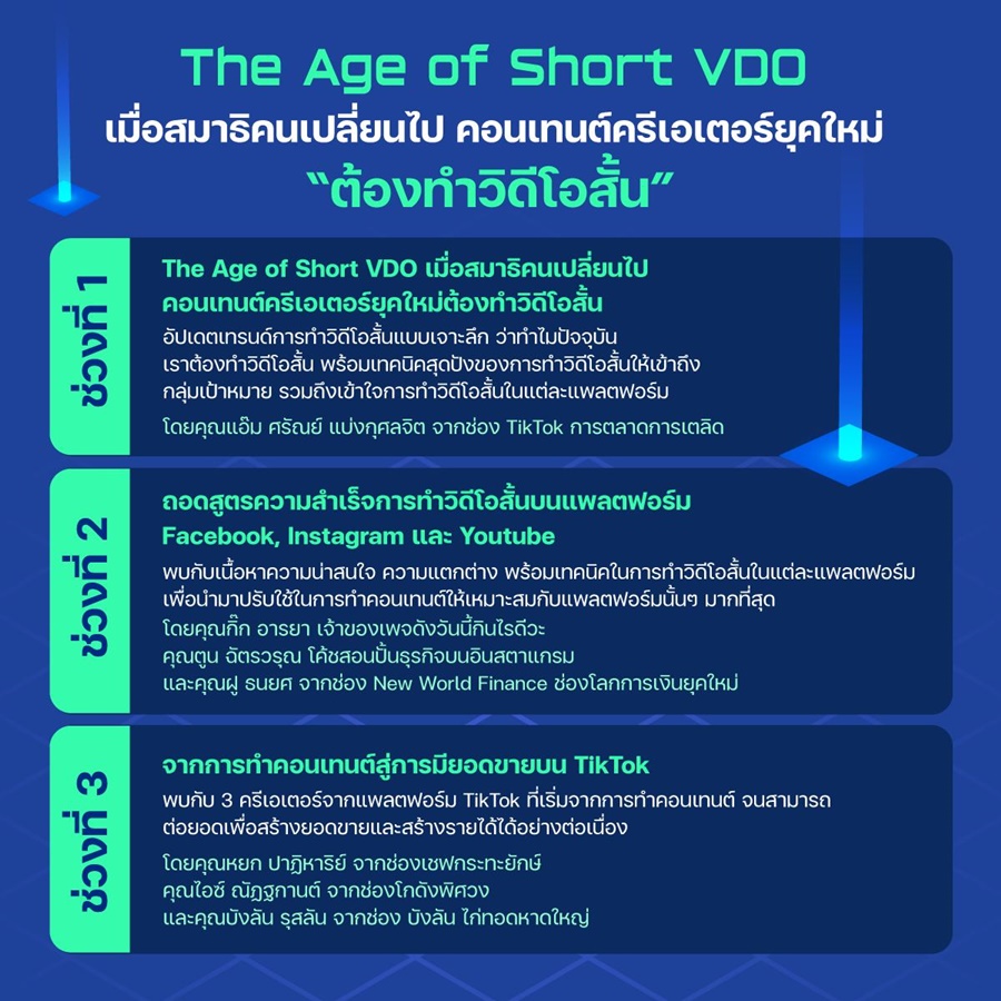 ภายในงานจะได้พบกับการอัปเดตเทรนด์ของการทำคอนเทนต์วิดีโอสั้นโดยเฉพาะ แบบจัดเต็มในทุกแพลตฟอร์ม!! แบ่งเป็น