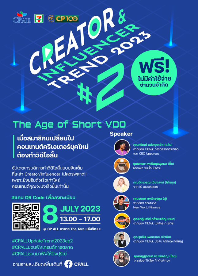กลับมาอีกครั้ง!! งานดี งานปัง ที่เหล่าครีเอเตอร์และอินฟลูเอนเซอร์ห้ามพลาดกับงาน CP ALL Creator & Influencer Trend 2023 #2 ในธีม The age of short VDO เมื่อสมาธิคนเปลี่ยนไป คอนเทนต์ครีเอเตอร์ยุคใหม่ต้องทำวิดีโอสั้น งานนี้ฟรี!! ไม่มีค่าใช้จ่าย