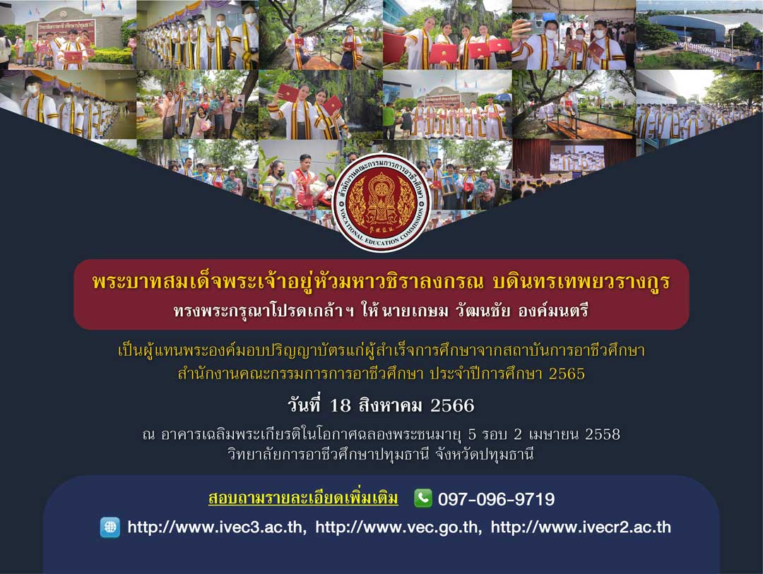 ว่าที่ร้อยตรีธนุ วงษ์จินดา เลขาธิการคณะกรรมการการอาชีวศึกษา เปิดเผยว่า ตามที่สถาบันการอาชีวศึกษา สำนักงานคณะกรรมการการอาชีวศึกษา กระทรวงศึกษาธิการ ได้รับพระมหากรุณาธิคุณจากพระบาทสมเด็จพระเจ้าอยู่หัวมหาวชิราลงกรณ บดินทรเทพยวรางกูร ทรงพระกรุณาโปรดเกล้า ให้ นายเกษม วัฒนชัย องค์มนตรี เป็นผู้แทนพระองค์มอบปริญญาบัตรแก่ผู้สำเร็จการศึกษาระดับปริญญาตรีสายเทคโนโลยีหรือสายปฏิบัติการ จากสถาบันการอาชีวศึกษา สังกัดสำนักงานคณะกรรมการการอาชีวศึกษา ทั้ง 23 แห่ง