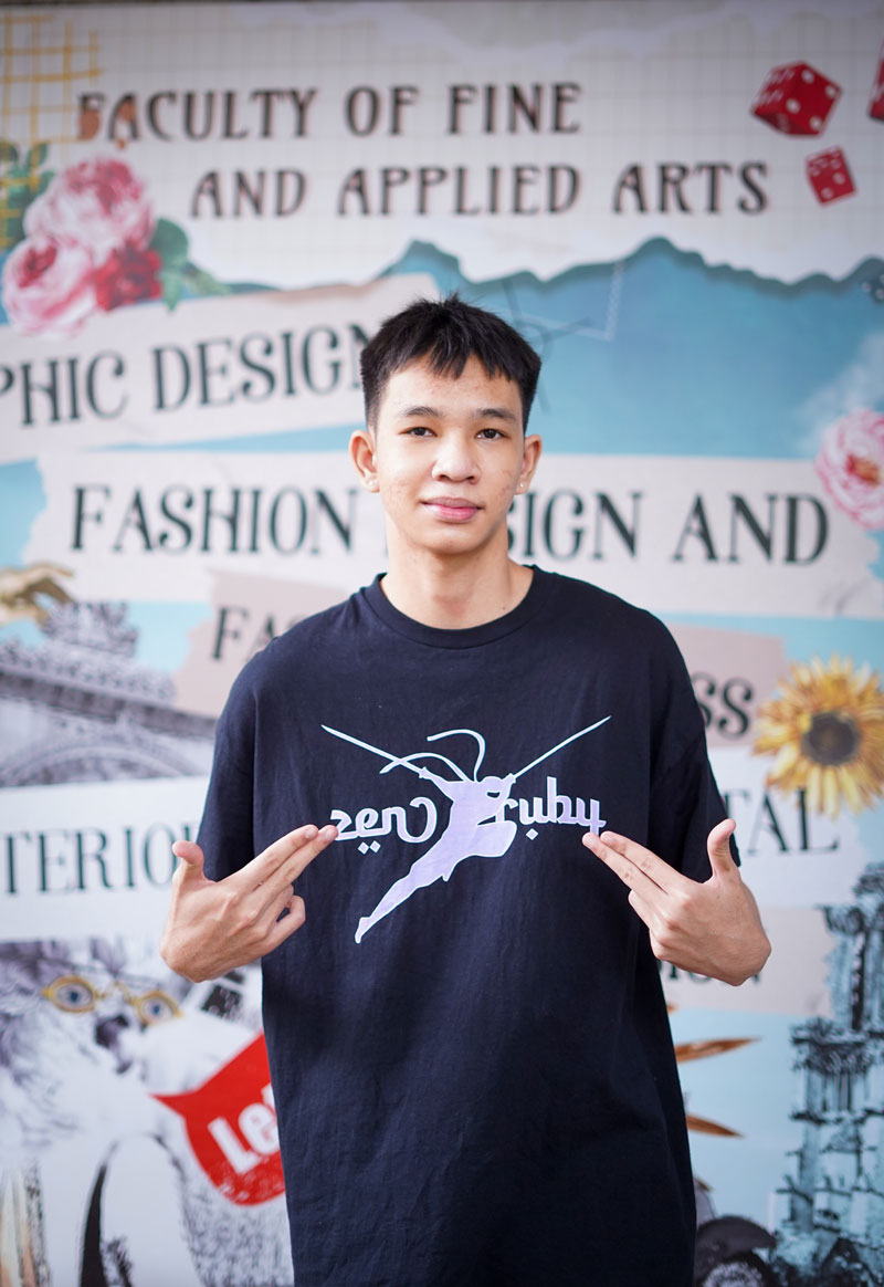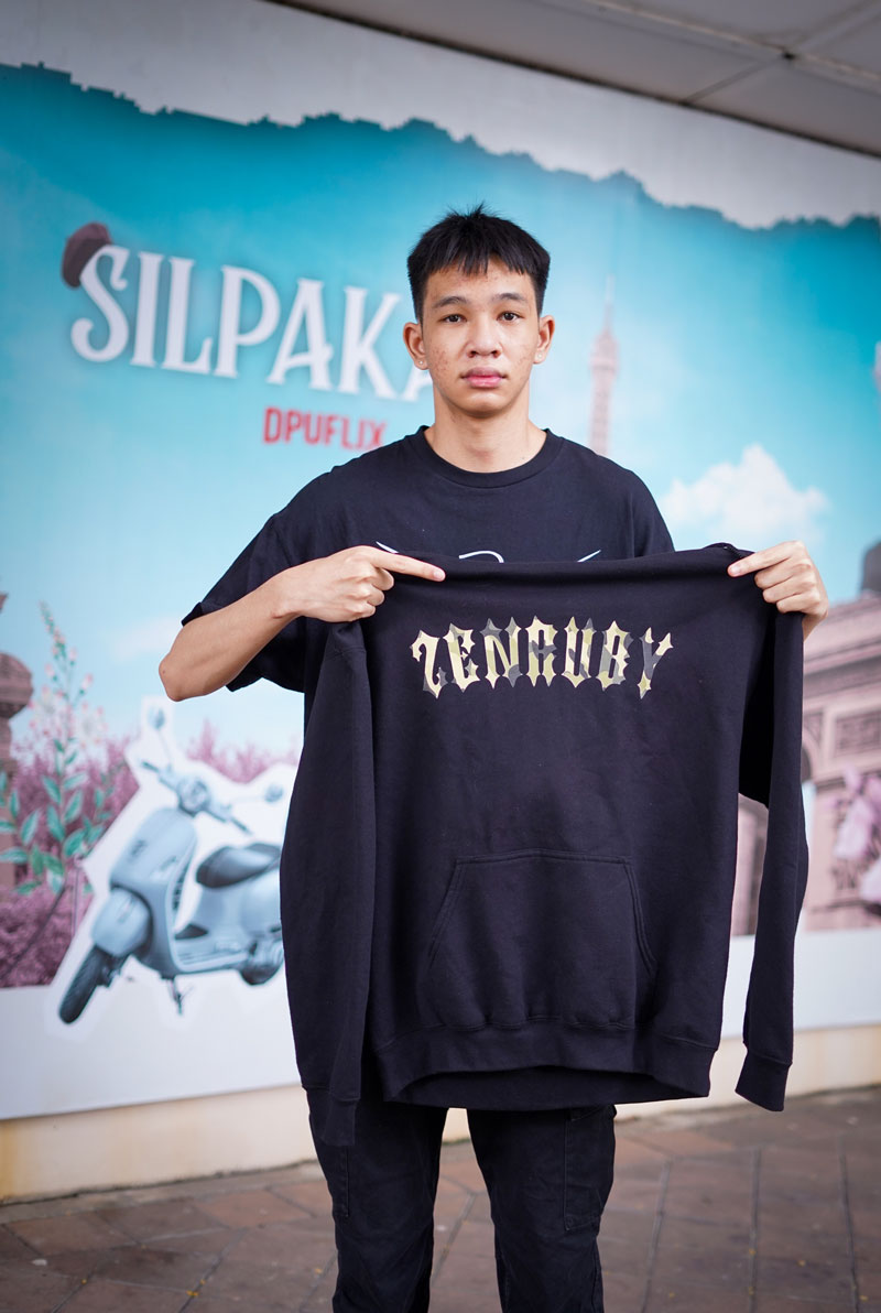 “เลือกไม่ผิดที่มาเรียนที่ DPU อย่างที่ป้ายโฆษณาสมัครเรียนบอกว่า ค้นพบตัวตนของเอง สร้างธุรกิจและสร้างมืออาชีพ ผมอยากมีหน้าร้าน แต่ไม่รู้จะทำยังไง จนได้มาโครงการเตรียมความพร้อมก่อนจะเปิดเทอม ได้เข้าร่วมกิจกรรม Design Entrepreneur สร้างรายได้จากลายเส้น ร่วมกับ Brother Commercial และ SKT Embroidery เครื่องจักรปักคอมพิวเตอร์ ที่ให้นักศึกษาปี1 นำผลงานออกแบบวาดเส้นสร้างสรรค์มาผลิตจริง เพื่อทดลองขาย ทำให้ผมได้รู้จักนวัตกรรมใหม่ๆ เกี่ยวกับเสื้อผ้า ไม่ได้มีแค่งานสกรีน DGT (Direct To Garment) มีอีกหลายอย่างที่เทคโนโลยีสามารถทำได้ที่เพิ่งรู้ สามารถเป็นกากเพชรได้ ปักลายได้ มันทำให้ผมเกิดไอเดียใหม่ๆ ที่ผมเอาไปใช้สร้างงานใหม่ง่ายขึ้นมากในตอนนี้”