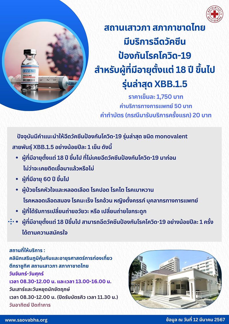 สถานเสาวภา สภากาชาดไทย มีบริการฉีดวัคซีนป้องกันโรคโควิด-19 สำหรับผู้ที่มีอายุตั้งแต่ 18 ปี ขึ้นไป รุ่นล่าสุด XBB.1.5 ราคาเข็มละ 1,750 บาท ค่าบริการทางการแพทย์ 50 บาท