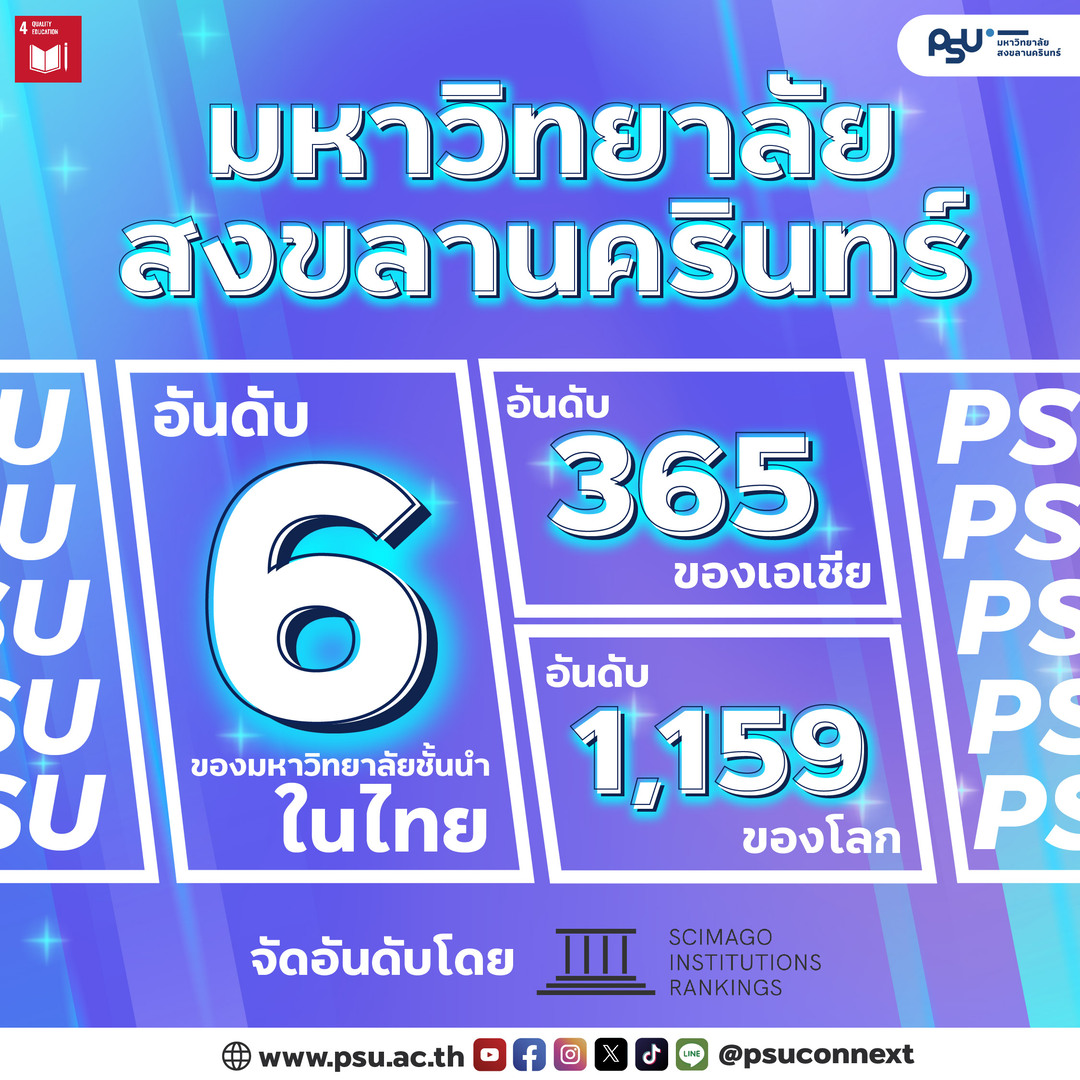 มหาวิทยาลัยสงขลานครินทร์ ได้รับจากการจัดอันดับมหาวิทยาลัยที่มีผลงานวิจัยและความสามารถในการเผยแพร่ผลงานวิชาการบนฐานข้อมูล Scopus ในระดับนานาชาติ โดย SCImago Institutions Ranking (SIR) 2024 โดยอยู่ในอันดับ 6 ของมหาวิทยาลัยชั้นนำในไทย อันดับ 365 ของเอเชีย และอันดับ 1,159 ของโลก