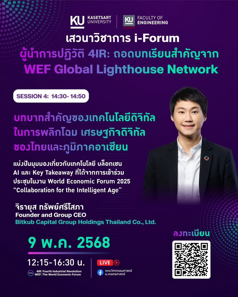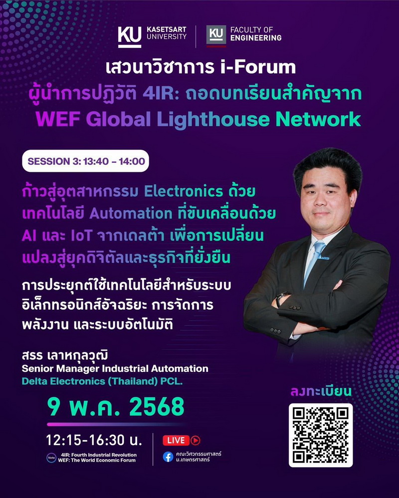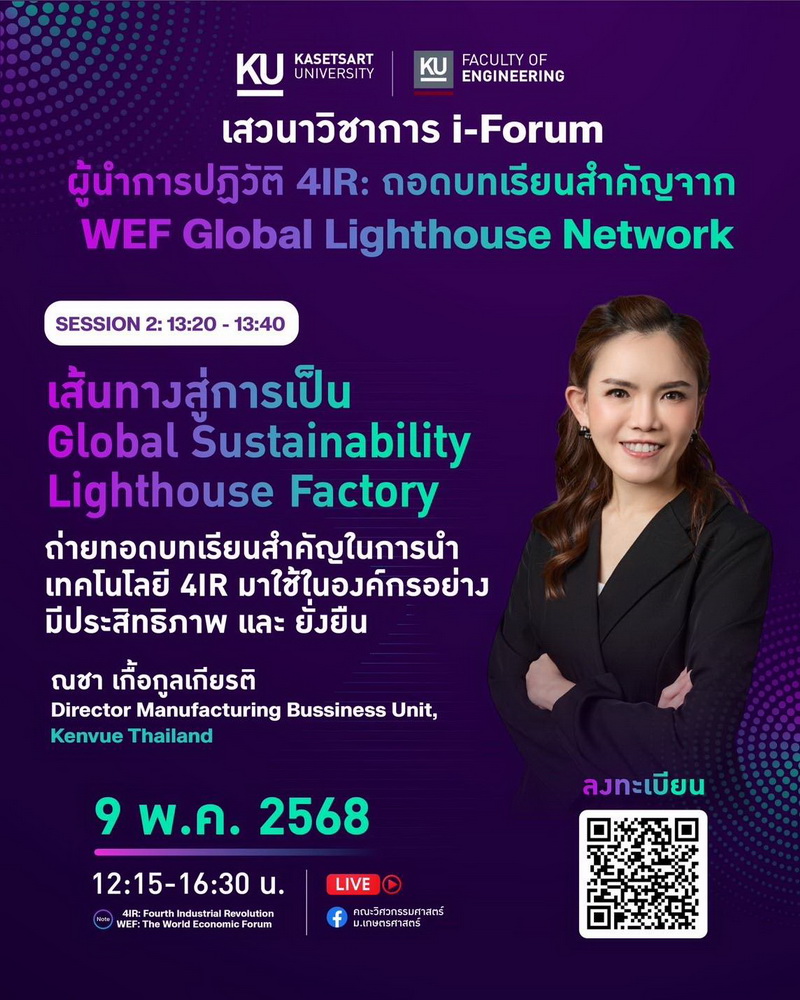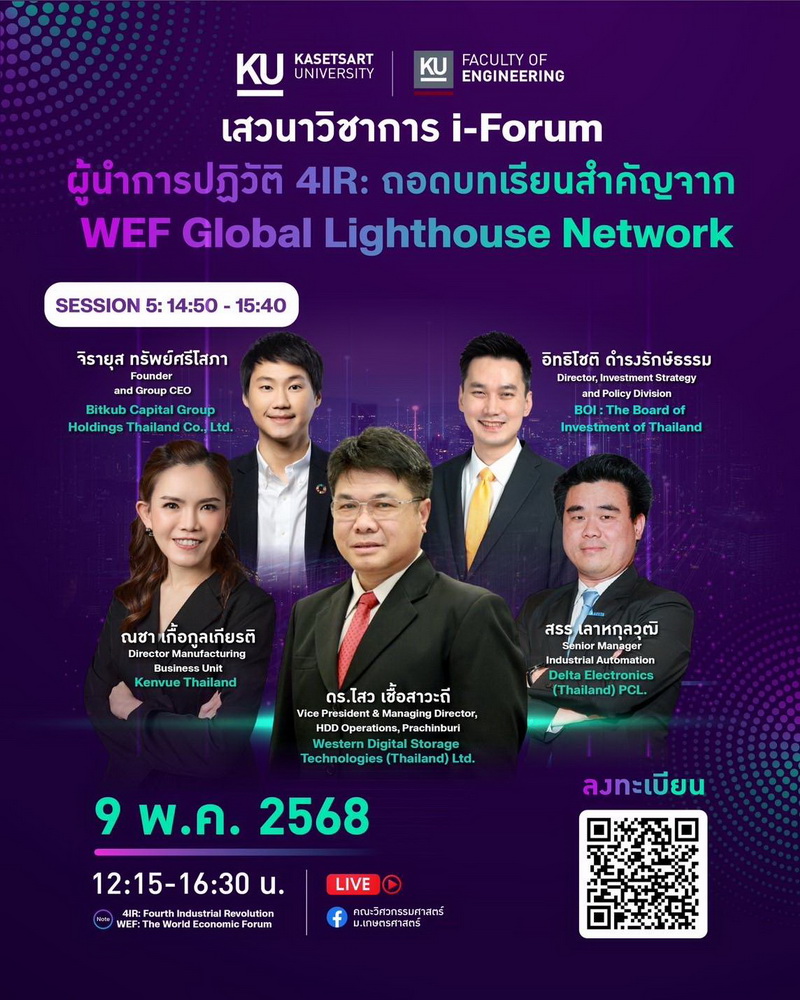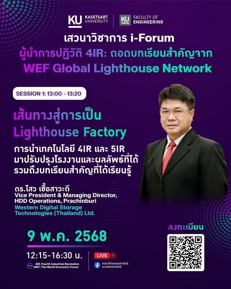 "ผู้นําการปฏิวัติ 4IR: ถอดบทเรียนสําคัญจาก WEF Global Lighthouse Network" ในวันที่ 9 พฤษภาคม 2568 เวลา 12.15 น. เป็นต้นไป ณ หอประชุมมหาวิทยาลัยเกษตรศาตร์ โดยได้รับเกียรติจาก ผู้เชี่ยวชาญระดับโลกที่จะมาแบ่งปันองค์ความรู้ และร่วมเสวนา