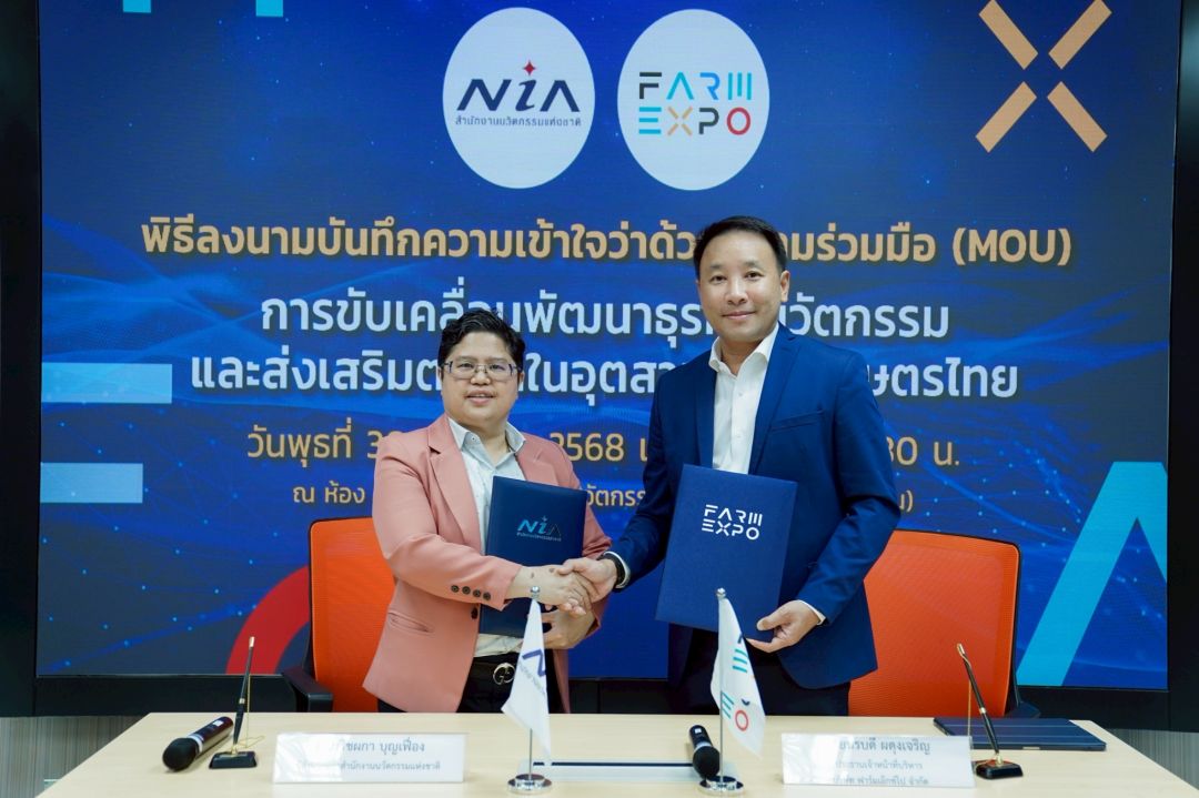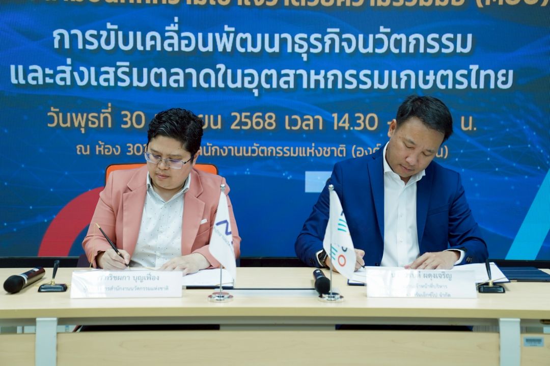 เมื่อวันพุธที่ 30 เม.ย. 68 ที่อาคารอุทยานนวัตกรรม สำนักงานนวัตกรรมแห่งชาติ (องค์การมหาชน) ดร.กริชผกา บุญเฟื่อง ผู้อำนวยการ สำนักงานนวัตกรรมแห่งชาติ สำนักงานนวัตกรรมแห่งชาติ (องค์การมหาชน) หรือ NIA และนายนรบดี ผดุงเจริญ ประธานเจ้าหน้าที่บริหาร บริษัท ฟาร์ม เอ็กซ์โป จำกัด ได้ร่วมพิธีลงนามบันทึกความเข้าใจ (MOU) ว่าด้วยความร่วมมือในการขับเคลื่อนการพัฒนาธุรกิจ เทคโนโลยี นวัตกรรม และการส่งเสริมตลาดในอุตสาหกรรมการเกษตรไทย
