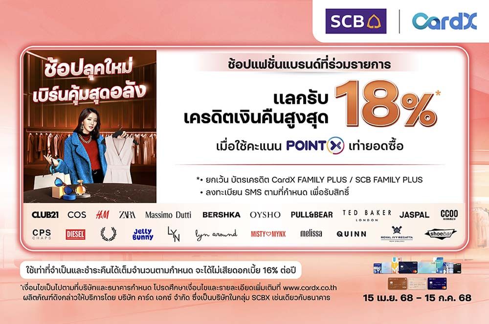 ช้อปแฟชั่นแบรนด์สุดฮิต แลกคะแนนรับเครดิตเงินคืนสูงสุด 18%* สำหรับลูกค้าบัตรเครดิต CardX และ SCB ที่ชื่นชอบแฟชั่นดีไซน์ระดับโลก เมื่อใช้จ่ายในแบรนด์ชั้นนำที่ร่วมรายการ อาทิ ZARA, H&M, COS, CLUB 21, JASPAL, CPS CHAPS, LYN, TED BAKER, DIESEL และอีกมากกว่า 20 แบรนด์ดัง ครอบคลุมทุกสไตล์ทั้งสุภาพบุรุษและสุภาพสตรี