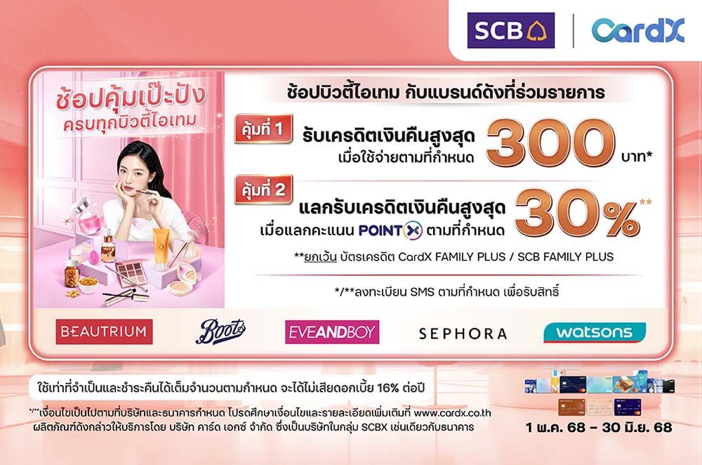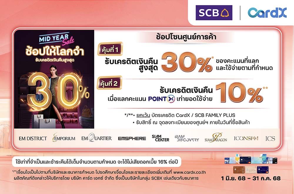 19 มิถุนายน 2568 นักช้อปตัวจริงห้ามพลาด! คาร์ดเอกซ์ ตอกย้ำภาพลักษณ์ผู้นำด้านไลฟ์สไตล์การใช้จ่าย ด้วยแคมเปญใหญ่แห่งปี “Mid-Year Sale ช้อปปังกลางปี ฟินคุ้มทุกไอเทม” ชวนลูกค้าบัตรเครดิต CardX และ SCB เพลิดเพลินไปกับประสบการณ์การช้อปปิงแบบเหนือระดับ ด้วยสิทธิพิเศษตอบโจทย์ทุกไลฟ์สไตล์ ตั้งแต่กลุ่มแฟชั่นนิสต้า บิวตี้เลิฟเวอร์ ไปจนถึงขาช้อปในห้างสรรพสินค้าและศูนย์การค้าชั้นนำ พร้อมมอบเครดิตเงินคืนสูงสุดกว่า 30%* ตลอดแคมเปญ