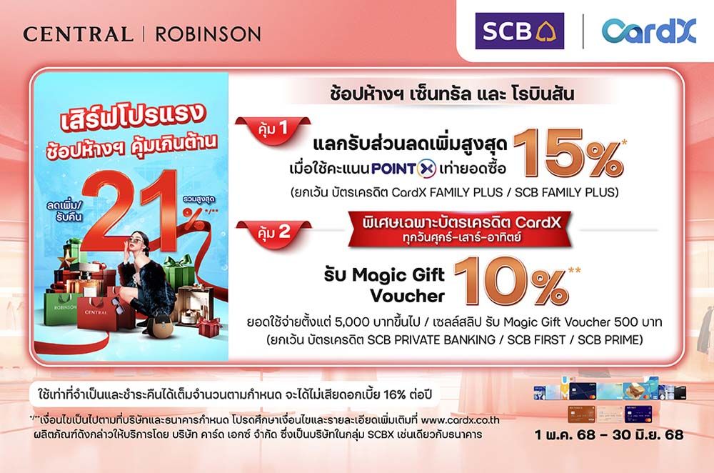 • คุ้ม 2: เฉพาะบัตร CardX ทุกศุกร์-เสาร์-อาทิตย์ รับ Magic Gift Voucher 10%** เมื่อใช้จ่ายครบ 5,000 บาทขึ้นไป/เซลล์สลิป รับ Magic Gift voucher 500 บาท (**ยกเว้นบัตรเครดิต SCB PRIVATE BANKING/ SCB FIRST/ SCB PRIME)