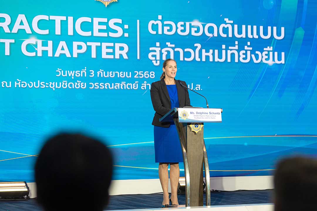 วันที่ 3 กันยายน 2568 พล.ต.ท.ภาณุรัตน์ หลักบุญ เลขาธิการ ป.ป.ส. พร้อมด้วย Ms. Delphine Schantz (เดลฟีน ช้านท์ซ) ผู้แทนสำนักงานว่าด้วยยาเสพติดและอาชญากรรมแห่งสหประชาชาติ (United Nations Office on Drugs and Crime: UNODC) ประจำภูมิภาคเอเชียตะวันออกเฉียงใต้และแปซิฟิกคณะเจ้าหน้าที่ประสานงานยาเสพติดต่างประเทศประจำประเทศไทย (Foreign Anti-Narcotics Community-FANC) และประชาชน ร่วมกิจกรรม “Best Practices: The Next Chapter ต่อยอดต้นแบบสู่ก้าวใหม่ที่ยั่งยืน” ณ ห้องประชุมชิดชัยฯ สำนักงาน ป.ป.ส. โดยงานในวันนี้จัดขึ้นเพื่อสร้างการรับรู้ผลการดำเนินงานป้องกัน ปราบปราม และแก้ไขปัญหายาเสพติดในรอบปีงบประมาณ 2568 ชูต้นแบบโมเดลแห่งความสำเร็จของชุมชนในการแก้ไขปัญหายาเสพติด พร้อมแนวทางการต่อยอดไปสู่ความยั่งยืน