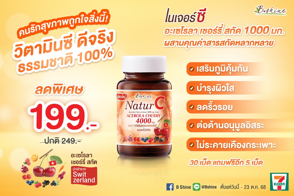 บีไชน์ เนเจอร์ซี อะเซโรลา เชอร์รี่ 1000 มก. สูตรใหม่ ให้วิตามินซีจากผลอะเซโรลาเชอร์รี่สด 4000 มก. เข้มข้นถึง 4 เท่า ช่วยเสริมภูมิคุ้มกัน เป็นวิตามินซีจากธรรมชาติ 100% ร่างกายจึงดูดซึมได้ดีกว่า อ่อนโยน ไม่ระคายเคืองกระเพาะ และมีซิตรัสไบโอฟลาโวนอยด์สูง ช่วยเพิ่มการดูดซึมวิตามินซีได้มากกว่า พร้อมด้วยสารสกัดจากทับทิมถึง 70 มก. บำรุงผิวให้กระจ่างใส สารสกัดจากเมล็ดลิ้นจี่ ช่วยให้ผิวกระชับ ลดริ้วรอย มิกซ์แคโรทีนอยด์ ช่วยปกป้องผิวจากแสงแดด และเบอร์รี่มิกซ์ 6 ชนิด บำรุงดวงตาให้สดใส ประโยชน์ครบในเม็ดเดียวเสริมภูมิคุ้มกัน ลดโอกาสการติดหวัด ลดอาการภูมิแพ้ ฟื้นฟูผิว บำรุงผิวพรรณให้สวยสดใส ลดริ้วรอย และต้านอนุมูลอิสระ แบบขวด 30 เม็ด (แถมฟรีอีก 5 เม็ด) มีโปรโมชั่นพิเศษ! เพียง 199 บาท จากราคาปกติ 249 บาท และสมาชิก All Member รับ 1 เหรียญ หาซื้อได้ที่ร้านเซเว่น อีเลฟเว่น ทุกสาขาทั่วประเทศ ตั้งแต่วันนี้ – 23 ตุลาคม 2568 เท่านั้น