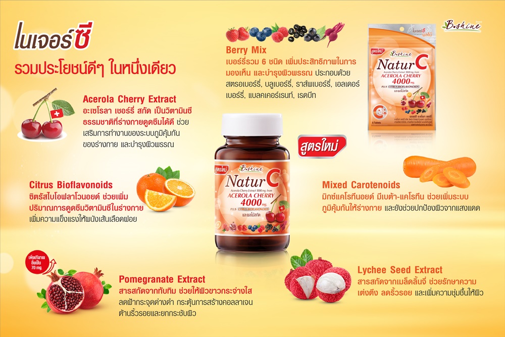 ในหนึ่งเม็ดอัดแน่นด้วยสารสกัดบำรุงผิวประสิทธิภาพสูง บีไชน์ เนเจอร์ซี สูตรใหม่ ยังอุดมไปด้วยสารสกัดจากผลไม้นานาชนิดที่ให้ประโยชน์ต่อต้านอนุมูลอิสระ และช่วยบำรุงผิวพรรณโดยเฉพาะ: ซิตรัสไบโอฟลาโวนอยด์ 100 มก.: มากกว่าผลิตภัณฑ์อื่นในท้องตลาด ช่วยเพิ่มการดูดซึมวิตามินซีได้อย่างมีประสิทธิภาพ สารสกัดจากทับทิม 70 มก.: ช่วยให้ผิวขาวใส ลดจุดด่างดำ และผิวเปล่งปลั่ง สารสกัดจากเมล็ดลิ้นจี่ 23.75 มก.: ช่วยให้ผิวเรียบเนียน ตึงกระชับ และลดริ้วรอย แคโรทีนอยด์ 23.75 มก.: ช่วยปกป้องผิวเสียจากแสงแดด และต้านอนุมูลอิสระเบอร์รี่มิกซ์ 120 มก.: (รวมถึงสตรอเบอร์รี่, บลูเบอร์รี่, ราสพ์เบอร์รี่ ฯลฯ) ช่วยบำรุงดวงตาให้สดใส