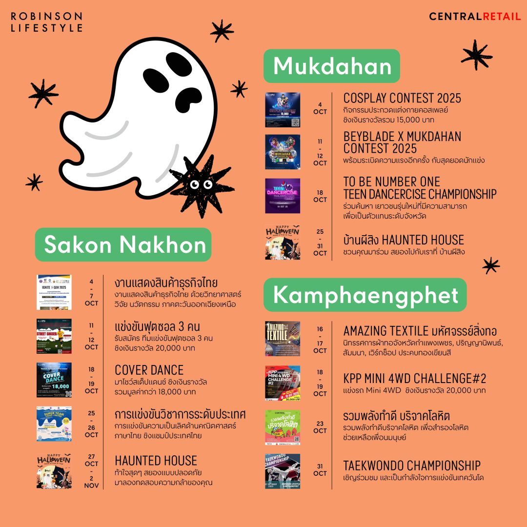 โรบินสันไลฟ์สไตล์ ศรีสมาน วันที่ 26 ต.ค. 68 เตรียมพบกับความสนุกแบบหลอนๆ กับ “HALLOWEEN CONTEST” ชวนทุกคนร่วมแต่งกายในธีมฮาโลวีนสุดครีเอทีฟ พร้อมขึ้นเวทีประชันความคิดสร้างสรรค์ ชิงทุนการศึกษาและถ้วยรางวัล