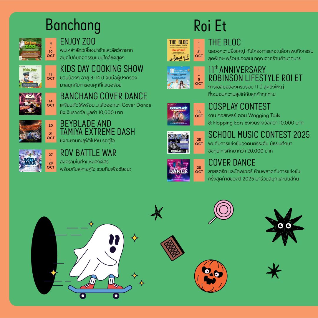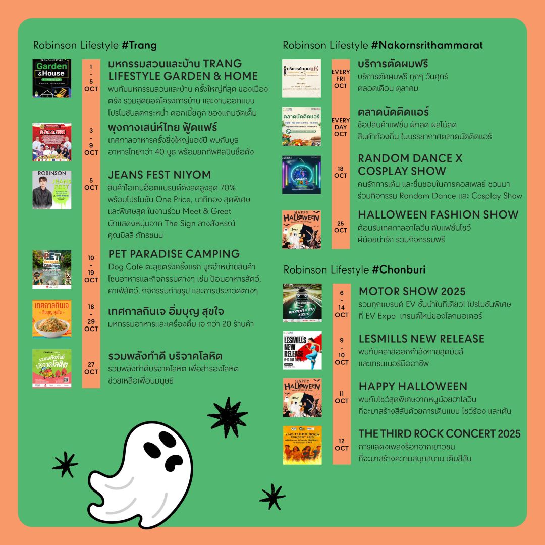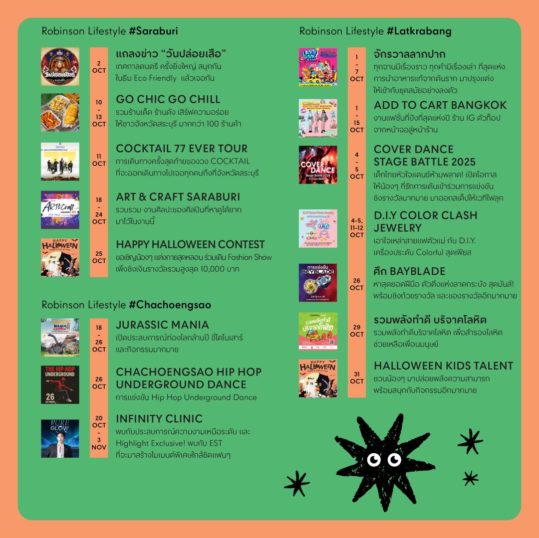 นอกจากนี้ ยังมีหลากหลายกิจกรรมสร้างสรรค์ เช่น งานเทศกาลอาหาร งานคอนเสิร์ต งานศิลปะวัฒนธรรม กิจกรรมกีฬา งานประกวดแข่งขันอี-สปอร์ต กิจกรรมสำหรับสัตว์เลี้ยง เวทีโชว์ความสามารถ เวิร์กช็อป รวมถึงมหกรรมสินค้าและอาหารเจ ตลอดจนกิจกรรมเพื่อสังคมอีกมากมายย ตลอดเดือนตุลาคมนี้ ที่ ศูนย์การค้าโรบินสันไลฟ์สไตล์ ทั้ง 27 สาขาทั่วประเทศ