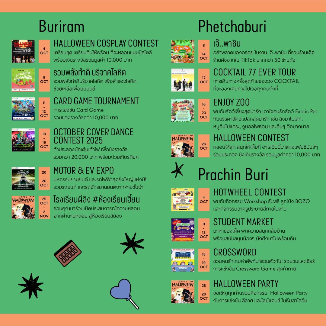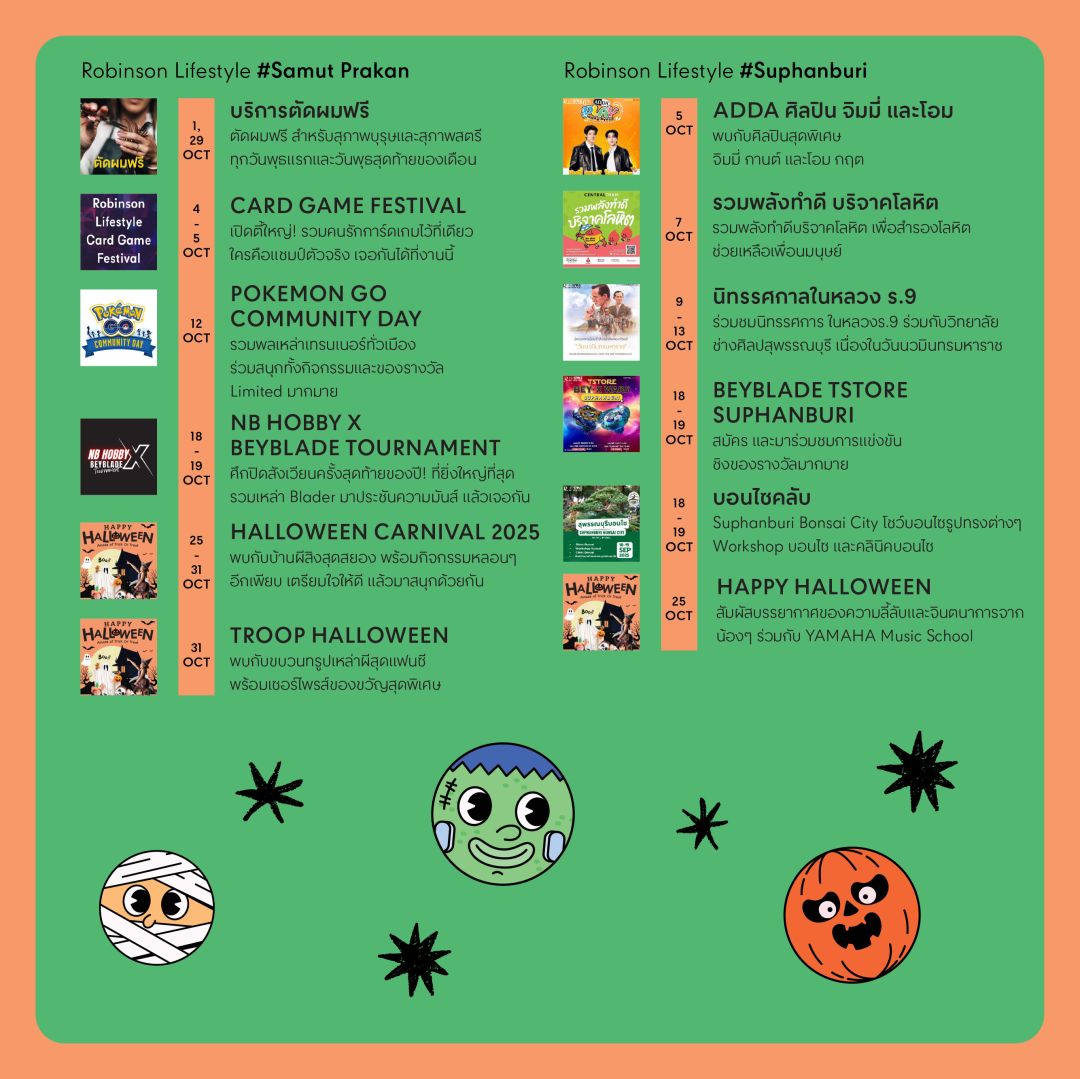 โรบินสันไลฟ์สไตล์ สมุทรปราการ วันที่ 25 ต.ค. 68 – 31 ต.ค. 68 สัมผัสความสยองแบบเต็มขั้นใน “HALLOWEEN CARNIVAL 2025” กับบ้านผีสิงสุดหลอน และกิจกรรมฮาโลวีนอีกมากมาย ที่จะพาคุณไปลุยโลกแฟนตาซีแบบสุดประทับใจ และวันที่ 31 ต.ค. 68 ปิดท้ายเดือนด้วยขบวน “TROOP HALLOWEEN” สุดแฟนซีจากเหล่าผีสายแฟ ที่จะออกมาเซอร์ไพรส์พร้อมของขวัญสุดพิเศษ และเติมสีสันให้ค่ำคืนฮาโลวีนสนุกยิ่งกว่าที่เคย