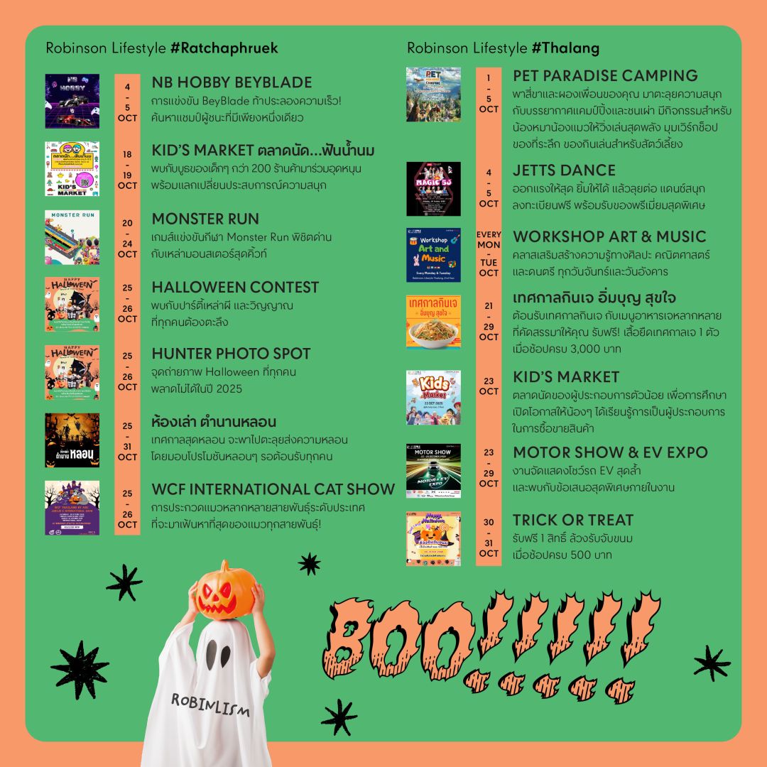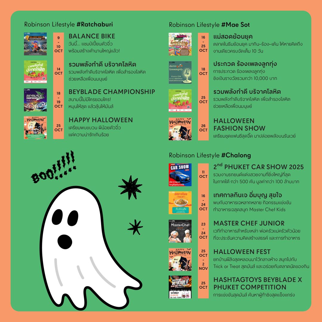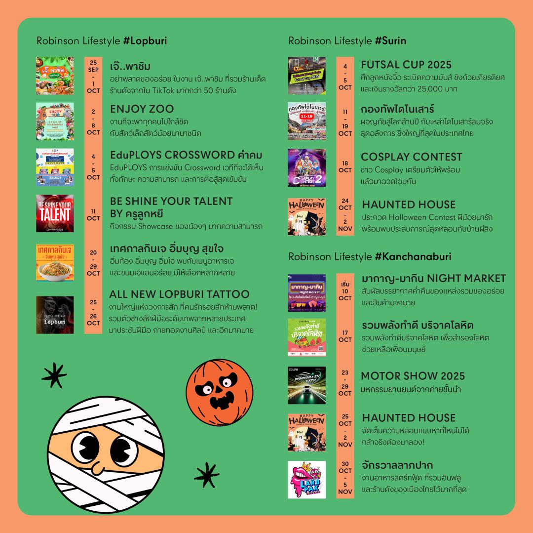 โรบินสันไลฟ์สไตล์ ฉลอง วันที่ 25 ต.ค. 68 – 2 พ.ย. 68 ท้าความกล้าใน “HALLOWEEN FEST” ที่ยกบ้านผีสิงสุดหลอนมาไว้กลางศูนย์การค้าฯ พร้อมสนุกกับกิจกรรม Trick or Treat และอิ่มอร่อยไปกับตลาดนัดของกินในบรรยากาศฮาโลวีนแบบจัดเต็ม