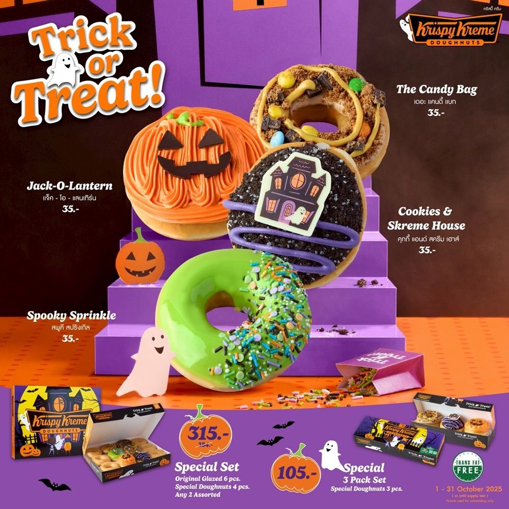 มาร่วมสนุกชวนหลอนรับเทศกาลฮาโลวีนกับ “Krispy Kreme Trick or Treat! Doughnuts” ในราคาเพียงชิ้นละ 35 บาท หรือจะเลือกซื้อแบบเซตที่มาพร้อมกล่องลายลิมิเต็ดทั้งแบบแพ็ก 3 ในราคา 105 บาท (ทริก ออร์ ทรีต โดนัท 3 ชิ้น) หรือแบบเซต ในราคาเพียง 315 บาท (ทริก ออร์ ทรีต โดนัท 4 ชิ้น, แอสซอร์ทเตท 2 ชิ้น และออริจินอล เกลซ 6 ชิ้น) ตั้งแต่วันที่ 1 – 31 ตุลาคม 2568 ณ ร้านคริสปี้ ครีม ทุกสาขาใกล้บ้านคุณ (ราคาดังกล่าว ยกเว้น สาขาสนามบินสุวรรณภูมิ, สนามบินดอนเมือง และแอปพลิเคชัน ฟู้ดดิลิเวอรี)