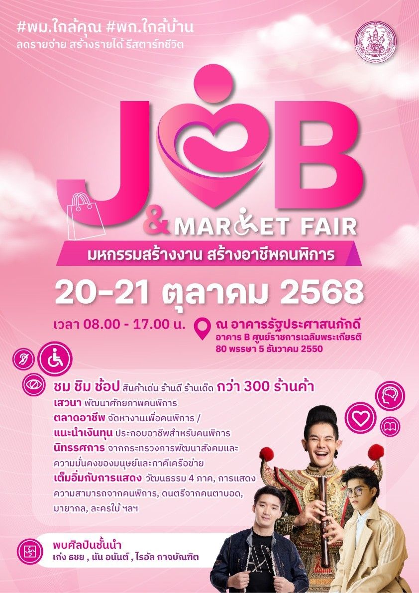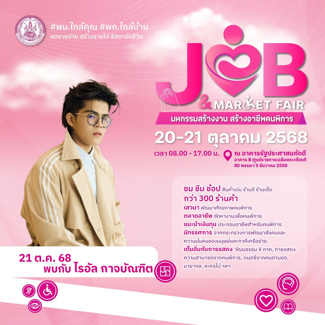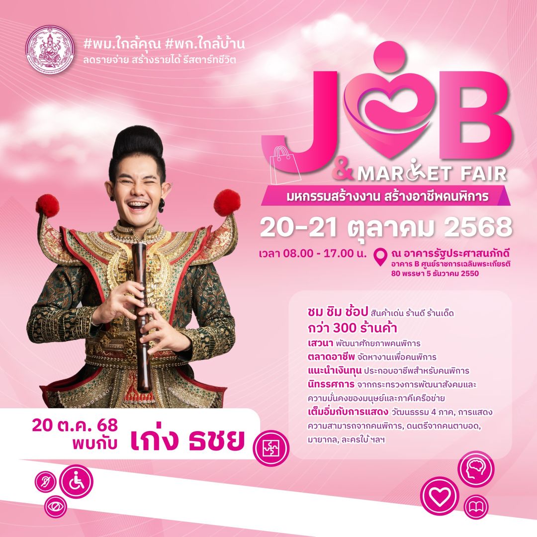 กระทรวงการพัฒนาสังคมและความมั่นคงของมนุษย์ (พม.) โดยกรมส่งเสริมและพัฒนาคุณภาพชีวิตคนพิการ (พก.) เตรียมจัดงาน “Job & Market Fair : มหกรรมสร้างงาน สร้างอาชีพคนพิการ” ระหว่างวันที่ 20–21 ตุลาคม 2568 ณ อาคารรัฐประศาสนภักดี (อาคาร B) ศูนย์ราชการเฉลิมพระเกียรติ ฯ แจ้งวัฒนะ กรุงเทพ ฯ ภายใต้นโยบายของนายอัครา พรหมเผ่า รัฐมนตรีว่าการกระทรวงการพัฒนาสังคมและความมั่นคงของมนุษย์ (พม.) “พม.ใกล้คุณ พก.ใกล้บ้าน ลดรายจ่าย สร้างรายได้ รีสตาร์ทชีวิต” เพื่อสร้างโอกาสที่ยั่งยืนให้แก่คนพิการและครอบครัว ผ่านความร่วมมือจากทุกภาคส่วน ทั้งภาครัฐ เอกชน สถาบันการศึกษา และภาคประชาสังคม โดยภายในงานจะมีตลาดอาชีพและสินค้าคนพิการกว่า 300 ร้านค้า , เวทีเสวนาและเวิร์กช็อปสร้างแรงบันดาลใจ ในการประกอบอาชีพยุคใหม่ ,การสาธิตอาชีพเชิงสร้างสรรค์ ,พิธีลงนาม MOU “เสริมสร้างโอกาสการจ้างงานและการประกอบอาชีพ” ,พิธีมอบรางวัล “We Can Do” เชิดชูคนพิการต้นแบบ และหน่วยงานสนับสนุนงานด้านคนพิการ ,นิทรรศการจาก พม. และภาคีเครือข่าย ถ่ายทอดนวัตกรรมและผลงานเด่น , การแสดงความสามารถของคนพิการ รวมถึงการแสดงทางวัฒนธรรมร่วมสมัย และมินิคอนเสิร์ตจากศิลปินชั้นนำ