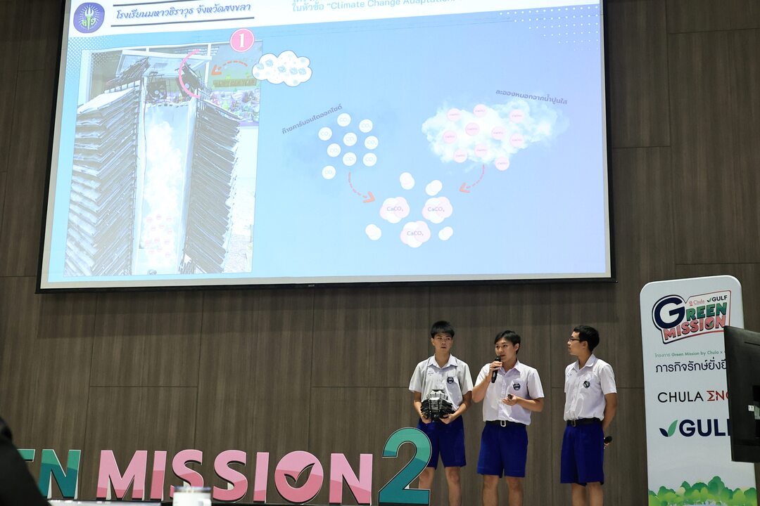 นายกันตภณ วณิชชานุกร นายกิตตินันนท์ อรรถศิริ และนายวชิรวิชญ์ ชาภูมี จากโรงเรียนมหิดลวิทยานุสรณ์ กล่าวว่า โครงการ Green Mission by Chula x GULF เป็นเวทีที่เปิดโลกและให้พวกเราได้แสดงออกถึงศักยภาพของเราครับ ขอขอบคุณที่พาไปเรียนรู้ ณ สถานีภาคพื้นดาวเทียมไทยคม และโรงไฟฟ้าอุทัย ซึ่งช่วยให้เราได้ความรู้และข้อมูลมาต่อยอดในโครงงาน การเข้าค่าย Bootcamp ทำให้ขอบเขตของงานเรากว้างขึ้นมาก เพราะได้ปรึกษากับอาจารย์และพี่ค่าย ถือเป็นประสบการณ์ที่มีคุณค่าในการคิดนวัตกรรมดี ๆ ที่จะช่วยโลกและผู้คนต่อไปครับ