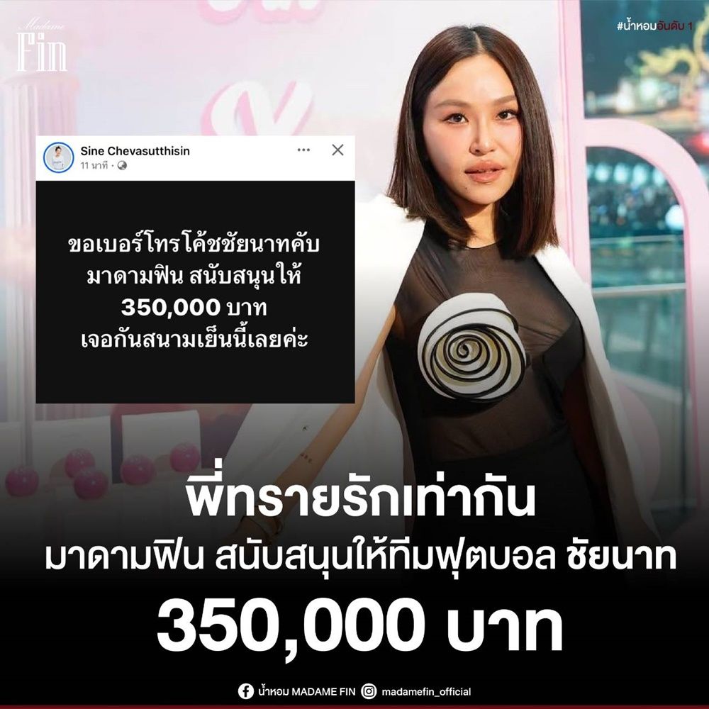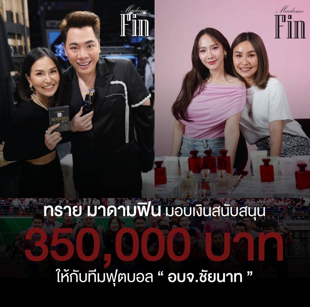 รวมพลังซุปเปอร์สตาร์และผู้ประกอบการใจบุญ! บริษัท มาดามฟิน จำกัด โดย "พี่ทราย ชีวสุทธิศิลป์" หรือ "พี่ทราย มาดามฟิน" แท็กทีมกับ "มดดำ คชาภา ตันเจริญ" และนางเอกเบอร์หนึ่ง "อั้ม พัชราภา ไชยเชื้อ" ร่วมกันมอบเงินสนับสนุนก้อนใหญ่จำนวน 350,000 บาทให้กับทีมฟุตบอลโรงเรียนองค์การบริหารส่วนจังหวัดชัยนาท เพื่อเป็นขวัญและกำลังใจให้นักกีฬา โดย "ทราย มาดามฟิน" เตรียมเดินทางไปมอบเงินด้วยตัวเองถึงสนามศุภชลาศัย