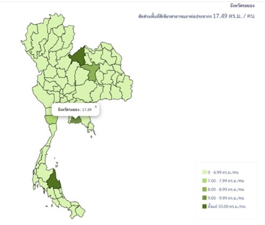 กระทรวงทรัพยากรธรรมชาติและสิ่งแวดล้อม โดยสำนักงานนโยบายและแผนทรัพยากรธรรมชาติและสิ่งแวดล้อม (สผ.) เผยแพร่ความสำคัญของพื้นที่สีเขียว พร้อมขับเคลื่อนระบบฐานข้อมูลด้านสิ่งแวดล้อมและพื้นที่สีเขียว (Thai Green Urban: TGU) ให้เป็นเครื่องมือของทุกภาคส่วนในการบริหารจัดการพื้นที่สีเขียวเมืองสอดคล้องกับแผนแม่บทภายใต้ยุทธศาสตร์ชาติ 20 ปี ที่ได้กำหนดเป้าหมายและตัวชี้วัดของพื้นที่สีเขียวเมืองไว้ที่ ร้อยละ 3 ภายในปี พ.ศ. 2570 และแนวทางปฏิบัติงานเพื่อขับเคลื่อนการจัดการพื้นที่สีเขียวอย่างยั่งยืน ระยะที่ 2 (พ.ศ. 2566 - 2570) ที่กำหนดเป้าหมายและตัวชี้วัดพื้นที่สีเขียวสาธารณะต่อประชากรไว้ที่ 10 ตารางเมตรต่อคน ทั้งนี้ สผ. ได้กำหนดนิยามและประเภทพื้นที่สีเขียว พร้อมทั้ง พัฒนาเครื่องมือให้กับทุกภาคส่วนได้ใช้ในการจัดเก็บข้อมูลด้วย