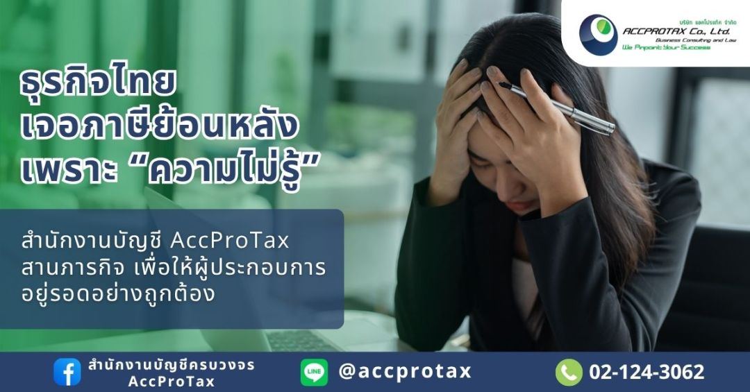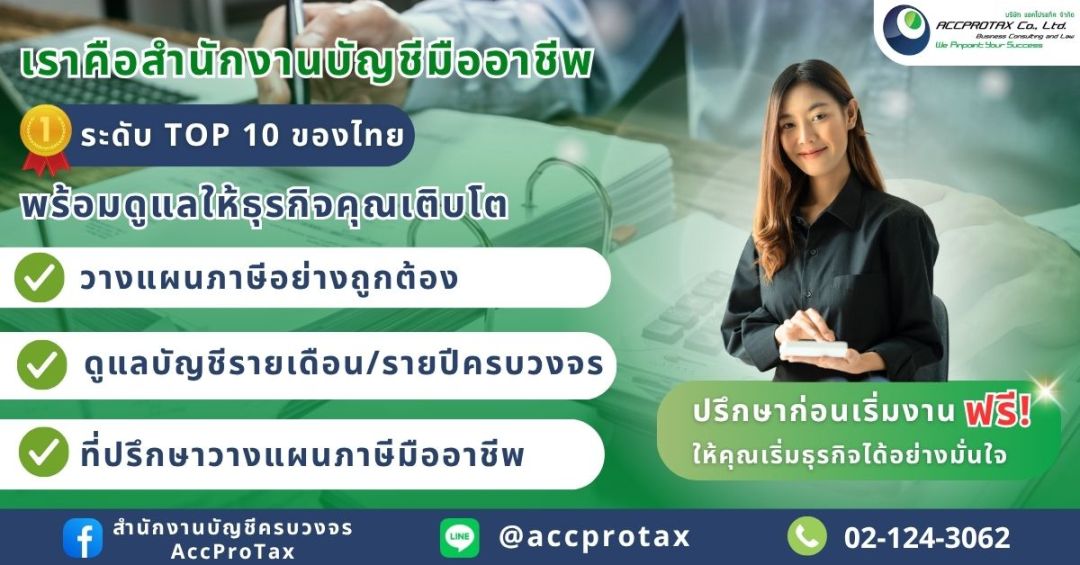 AccProTax เป็นสำนักงานบัญชีที่ให้บริการด้านบัญชี ยื่นภาษีประจำเดือน วางแผนภาษี และจดทะเบียนธุรกิจแบบครบวงจร ด้วยประสบการณ์ยาวนานกว่า 25 ปี ภายใต้แนวคิด “เข้าใจก่อนทำ” เพื่อให้ผู้ประกอบการสามารถวางแผนภาษีได้ถูกต้องตั้งแต่เริ่มต้นก้าวแรกของธุรกิจ ไปสู่ความสำเร็จอย่างมั่นคง ทีมงานประกอบด้วยนักบัญชี และที่ปรึกษาภาษีมืออาชีพ ที่มีประสบการณ์จริง พร้อมให้คำแนะนำฟรีก่อนเริ่มงาน และมีการรายงานผลประกอบการให้กิจการต่างๆ ทุกเดือน ดูแลอย่างใกล้ชิด เพื่อช่วยให้ธุรกิจของคุณเติบโตอย่างยั่งยืน มั่นคง และโปร่งใส สอบถามข้อมูลเพิ่มเติมได้ที่ เว็บไซต์: www.accprotax.com หมายเลขโทรศัพท์: 02 124 3062 หรือ Line Official: @accprotax