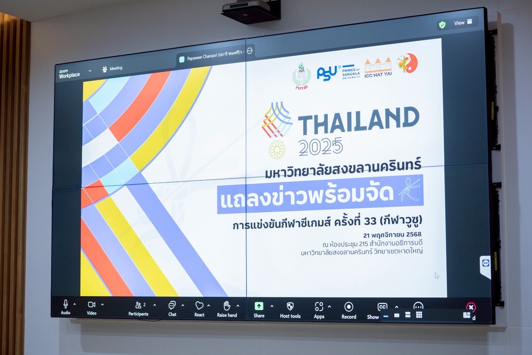 มหาวิทยาลัยสงขลานครินทร์ นำโดย รองศาสตราจารย์ ดร.วศิน สุวรรณรัตน์ รองอธิการบดีวิทยาเขตหาดใหญ่ พร้อมด้วย นางสาวดารณี ทองประชุม ผู้อำนวยการศูนย์ประชุมนานาชาติฉลองสิริราชสมบัติครบ ๖๐ ปี นางอุไรวรรณ จันลาภ ผู้อำนวยการสำนักงานการกีฬาแห่งประเทศไทยจังหวัดสงขลา นางสาวศิรินภา ห่อชื่อ ผู้ช่วยเลขาธิการสมาคมกีฬาวูซูแห่งประเทศไทย และตัวแทนจากชมรมกีฬาวูซูจังหวัดสงขลา ร่วมแถลงเตรียมความพร้อมจัดการแข่งขันกีฬาซีเกมส์ ครั้งที่ 33 ประเภทกีฬาวูซู ในระหว่างวันที่ 13-15 ธันวาคม 2568 ณ สนามการแข่งขันศูนย์ประชุมนานาชาติฉลองสิริราชสมบัติครบ ๖๐ ปี ม.อ. หาดใหญ่ โดยมีบุคลากร ตัวแทนนักศึกษา ม.อ. เข้าร่วม ณ ห้องประชุม 215 สำนักงานอธิการบดี มหาวิทยาลัยสงขลานครินทร์ วิทยาเขตหาดใหญ่ เมื่อวันที่ 21 พฤศจิกายน 2568