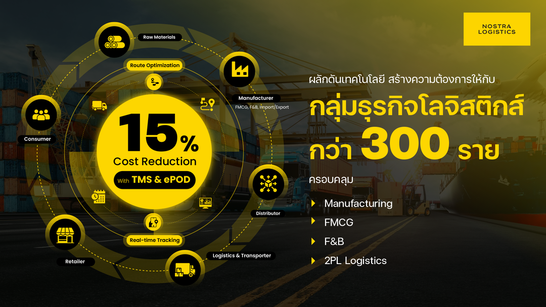 จุดต่างที่ทำให้ NOSTRA LOGISTICS ยืนหนึ่งเป็นผู้นำด้านแพลตฟอร์มเทคโนโลยีขนส่งโลจิสติกส์ของไทยนั้น คือการนำระบบบริหารจัดการขนส่ง TMS (Transportation Management System) ทำงานร่วมกับโมบายแอปพลิเคชันสำหรับติดตามด้วยมือถือ ePOD (Electronic Proof of Delivery) ลดต้นทุนค่าฮาร์ดแวร์ ยกระดับประสิทธิภาพการทำงาน ตั้งแต่การจัดรถ การวางแผนเส้นทาง การจัดรอบวิ่งรถ ไปจนถึงการติดตามสถานะการจัดส่งและปิดงานพร้อมหลักฐานการจัดส่งแบบเรียลไทม์ ช่วยลดเวลาการวางแผน ลดรอบวิ่งรถที่ซ้ำซ้อน เพิ่มความแม่นยำในการส่งมอบสินค้า (On-Time Delivery) ที่สำคัญคือสามารถพัฒนาระบบให้เข้ากับกระบวนการทางธุรกิจของพันธมิตรเพื่อตอบโจทย์การทำงานอย่างสมบูรณ์ ซึ่งทำให้ผู้ประกอบการสามารถบริหารต้นทุนในแต่ละขั้นตอนได้อย่างมีประสิทธิภาพ สะท้อนถึงการเติบโตของเทคโนโลยีนี้อย่างต่อเนื่อง และสร้างความต้องการให้หลายอุตสาหกรรม ครอบคลุมตั้งแต่