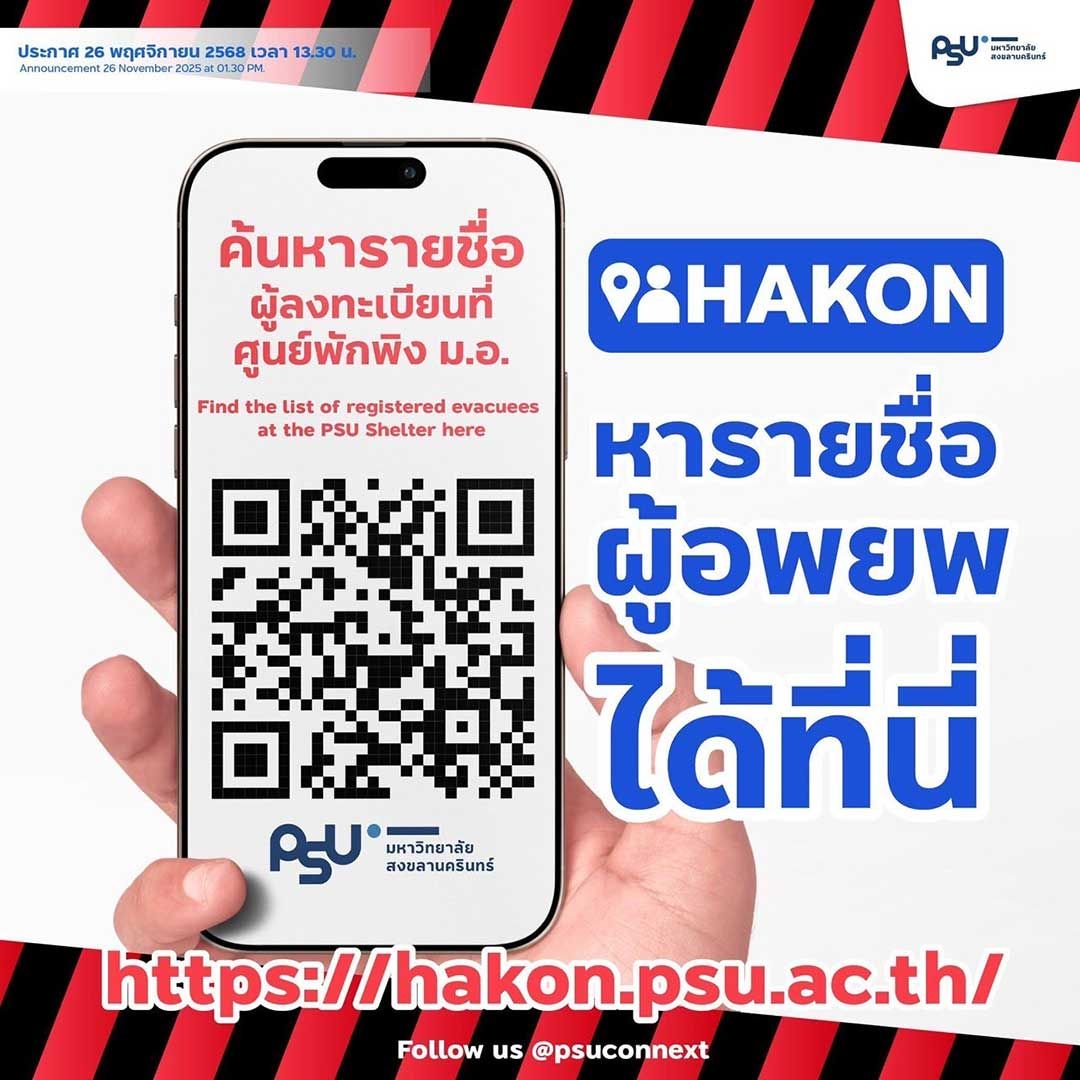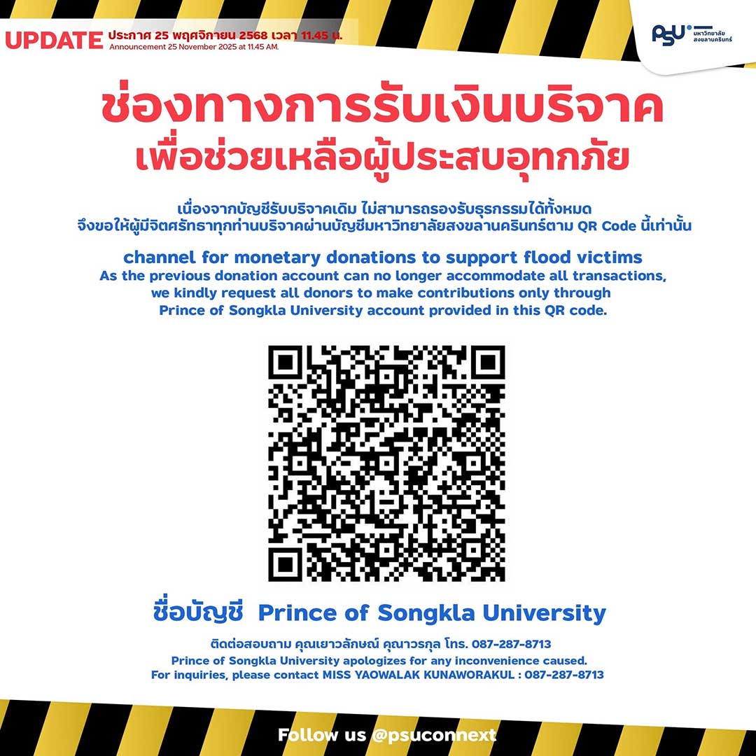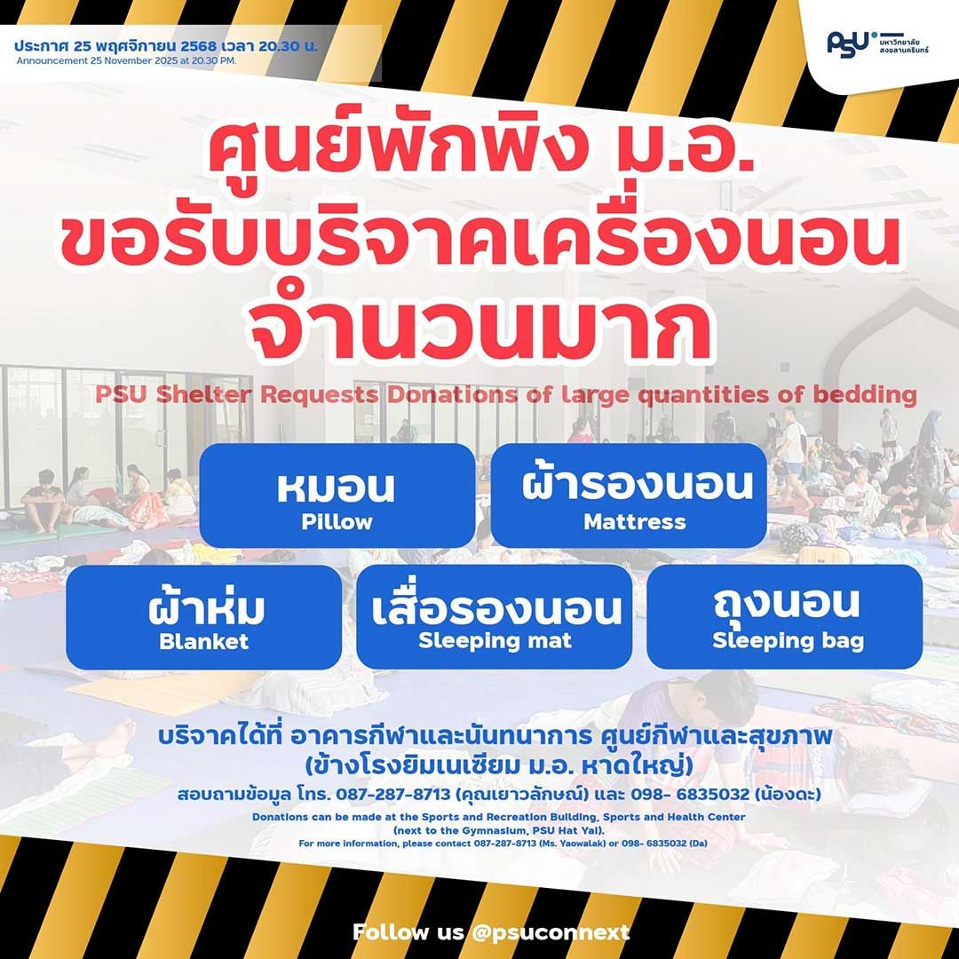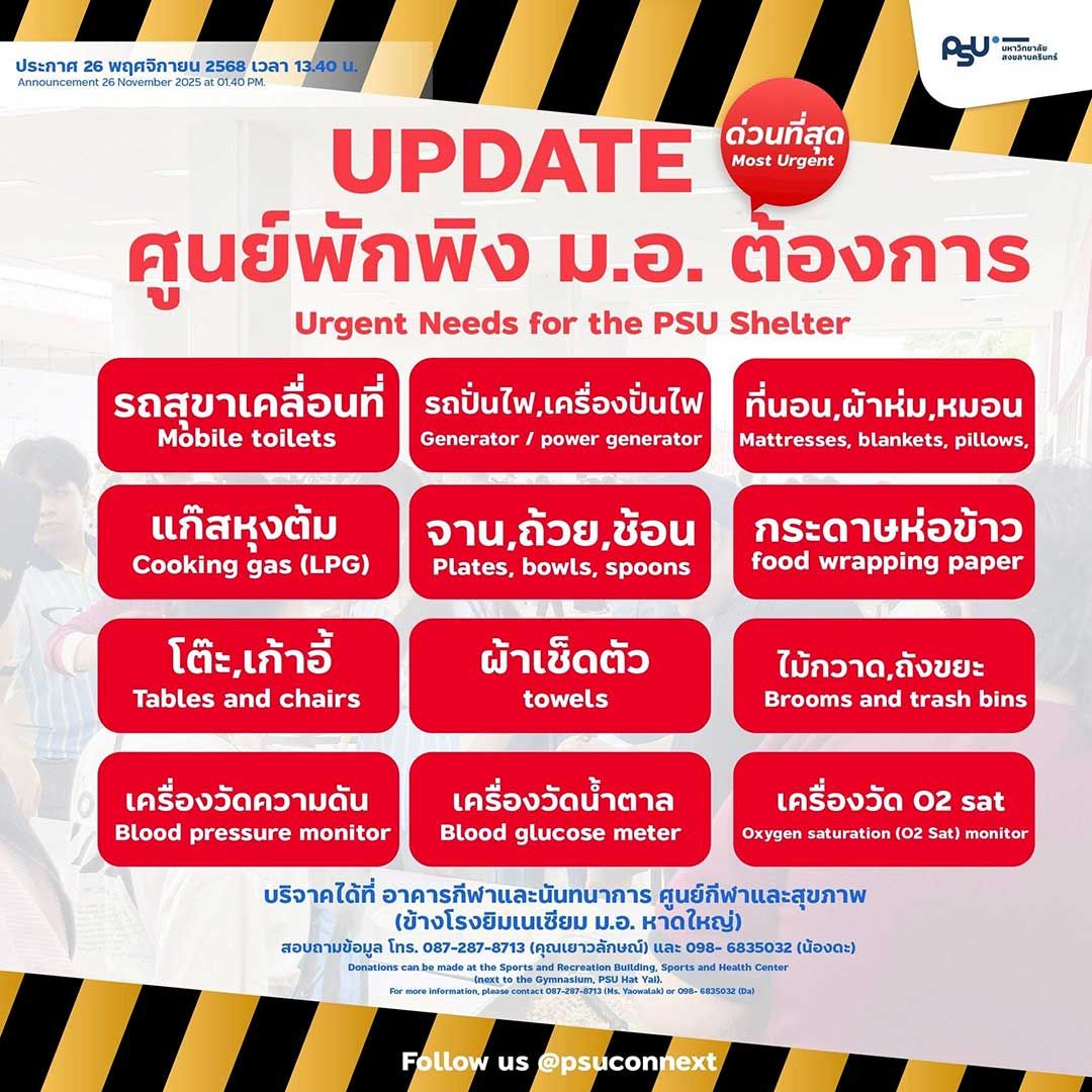 มหาวิทยาลัยสงขลานครินทร์ย้ำว่าพร้อมปฏิบัติหน้าที่เคียงข้างประชาชนในสถานการณ์ครั้งนี้อย่างเต็มกำลัง โดยจะประเมินสถานการณ์น้ำและความต้องการของผู้ประสบภัยอย่างต่อเนื่อง เพื่อให้การช่วยเหลือดำเนินไปอย่างเป็นระบบและตอบสนองความจำเป็นเร่งด่วนของชุมชนในพื้นที่อำเภอหาดใหญ่ได้อย่างมีประสิทธิภาพที่สุด