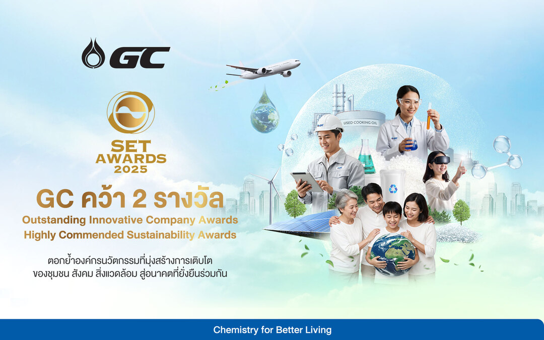 กรุงเทพฯ – 28 พฤศจิกายน 2568 – บริษัท พีทีที โกลบอล เคมิคอล จำกัด (มหาชน) หรือ GC ได้รับ 2 รางวัลอันทรงเกียรติจากเวที SET Awards 2025 ได้แก่ รางวัลเกียรติยศแห่งความสำเร็จด้านนวัตกรรม “Outstanding Innovative Company Awards” จากโครงการเชื้อเพลิงอากาศยานแบบยั่งยืน (Sustainable Aviation Fuel: SAF) และรางวัล “Highly Commended Sustainability Awards” องค์กรที่มีผลการดำเนินงานด้านความยั่งยืนโดดเด่นเป็นพิเศษสำหรับบริษัทจดทะเบียนไทย จัดโดยตลาดหลักทรัพย์แห่งประเทศไทยร่วมกับวารสารการเงินธนาคาร โดยมีนายณะรงค์ศักดิ์ จิวากานันต์ ประธานเจ้าหน้าที่บริหาร (CEO) และ นายพรรคพงษ์ วังรัตนโสภณ ประธานเจ้าหน้าที่ปฏิบัติการ กลุ่มธุรกิจผลิตภัณฑ์เคมีขั้นต้นและขั้นกลาง เป็นผู้รับมอบ ตอกย้ำจุดยืนการเป็นองค์กรนวัตกรรมที่มุ่งมั่นพัฒนานวัตกรรมและเทคโนโลยีเพื่อขับเคลื่อนอนาคต ดำเนินธุรกิจบนพื้นฐานของการสร้างสมดุุลสิ่งแวดล้อม สังคม เศรษฐกิจ และการกำกับดูแลกิจการที่ดี เพื่อความยั่งยืน