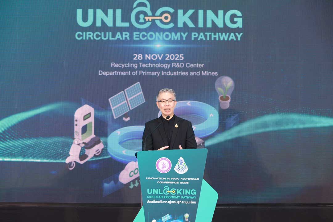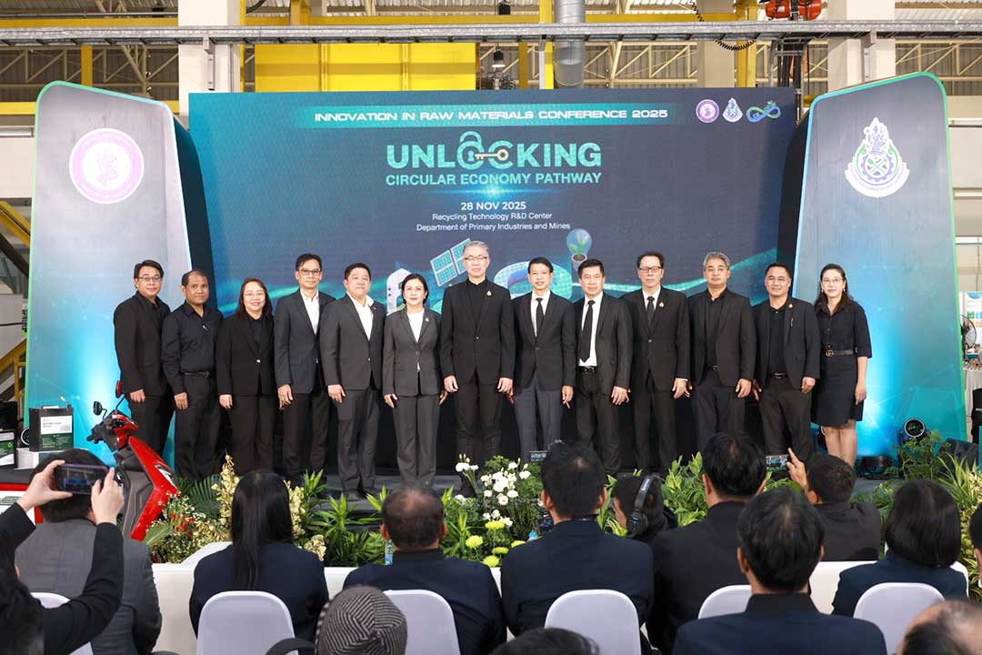 สมุทรปราการ 28 พฤศจิกายน 2568 - นายณัฐพล รังสิตพล ปลัดกระทรวงอุตสาหกรรม เป็นประธานในพิธีเปิดงานสัมมนาวิชาการ Innovation in Raw Materials Conference 2025 ในหัวข้อ “Unlocking Circular Economy Pathway ปลดล็อกเส้นทางสู่เศรษฐกิจหมุนเวียน” จัดโดยกรมอุตสาหกรรมพื้นฐานและการเหมืองแร่ (กพร.) ณ ศูนย์วิจัยและพัฒนาเทคโนโลยีรีไซเคิล อำเภอพระประแดง จังหวัดสมุทรปราการ เพื่อผลักดันนวัตกรรมและเทคโนโลยีสู่การผลิตวัตถุดิบ (ทดแทน/ขั้นสูง) ในเชิงพาณิชย์ ส่งเสริมให้ผู้ประกอบการ มีความรู้ ความเข้าใจ และสามารถนำหลักการเศรษฐกิจหมุนเวียน (Circular Economy) ไปประยุกต์ใช้เพื่อพัฒนาองค์กรควบคู่กับความยั่งยืน พร้อมถ่ายทอดความสำเร็จของนวัตกรรมและเทคโนโลยีวัตถุดิบทดแทนและวัตถุดิบขั้นสูง เดินหน้าเสริมสร้างศักยภาพผู้ประกอบการไทยด้วยเศรษฐกิจหมุนเวียน มุ่งสู่สังคมคาร์บอนต่ำ โดยภายในงานมีการเปิดตัว “ต้นแบบแบตเตอรี่ EV จากการรีไซเคิล” ที่พัฒนาได้สำเร็จเป็นครั้งแรก