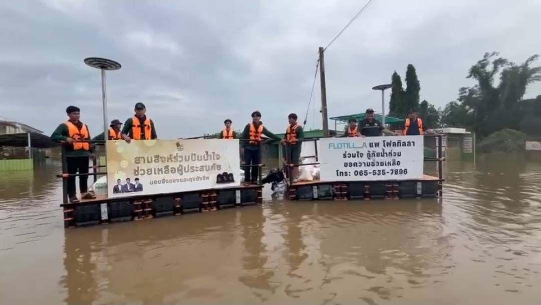 วันนี้ (30 พ.ย.68) ผู้สื่อข่าวรายงานว่า บริษัท โฟลทิลลาเทคโนโลยี จำกัด "ผู้ผลิตและจำหน่ายทางเดินฉุกเฉินแพลอยน้ำอัจฉริยะ เซฟโฟลต" ได้ส่งมอบแพลอยน้ำกู้ภัยเซฟโฟลต จำนวน 8 ชุด พร้อมทีมจิตอาสา 11 คน เดินทางจาก อ.บ้านโพธิ์ จ.ฉะเชิงเทรา มุ่งหน้าไปยัง อ.หาดใหญ่ จ.สงขลา พื้นที่ที่ได้รับผลกระทบจากอุทกภัยน้ำท่วม เพื่อให้การช่วยเหลือผู้ประสบภัยในพื้นที่ภาคใต้