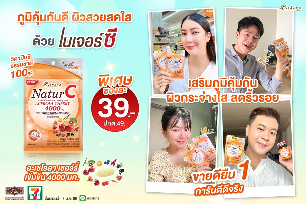 บริษัท บีไชน์ นูทริชั่น พลัส จำกัด จัดโปรโมชั่นต้อนรับลมหนาวด้วย “บีไชน์ เนเจอร์ซี สูตรใหม่” วิตามินซีธรรมชาติ 100% แบบซองพกพาสะดวก ขนาด 6 เม็ด ราคาพิเศษ เพื่อช่วยดูแลทุกคนให้สุขภาพดีและแข็งแรง เพียงซองละ 39 บาท (จากปกติ 49 บาท) และพิเศษยิ่งขึ้นสำหรับสมาชิก ALL member รับส่วนลดเพิ่มอีก 1 บาท ซื้อได้ตั้งแต่วันนี้ - 3 มกราคม 2569 ที่ร้านเซเว่น อีเลฟเว่น ทุกสาขาทั่วประเทศ