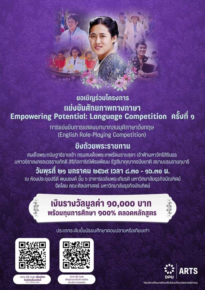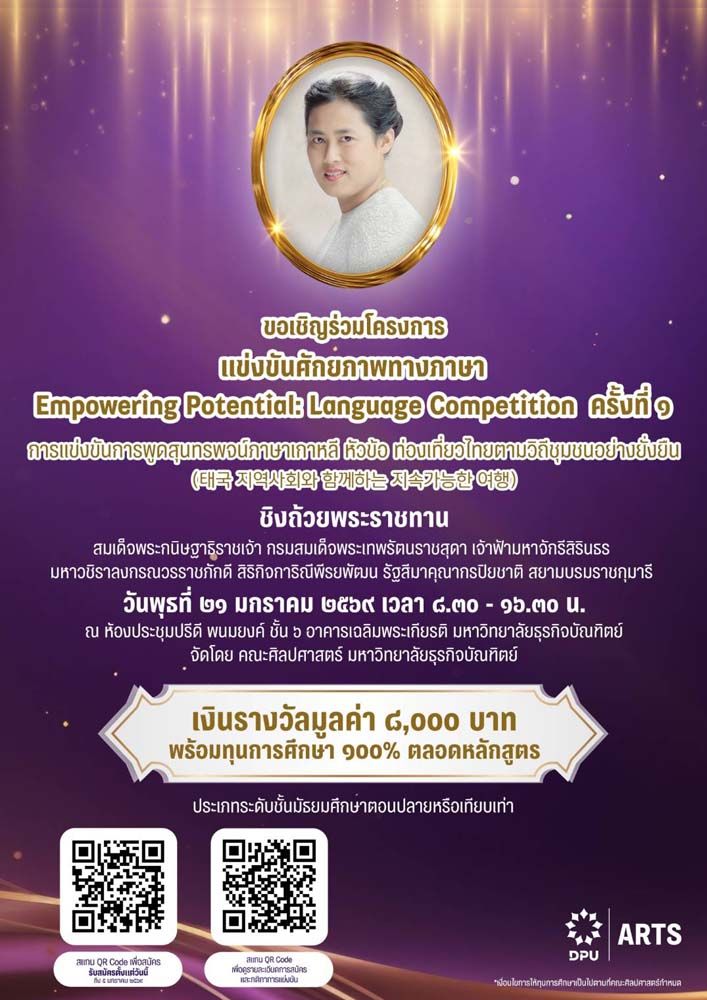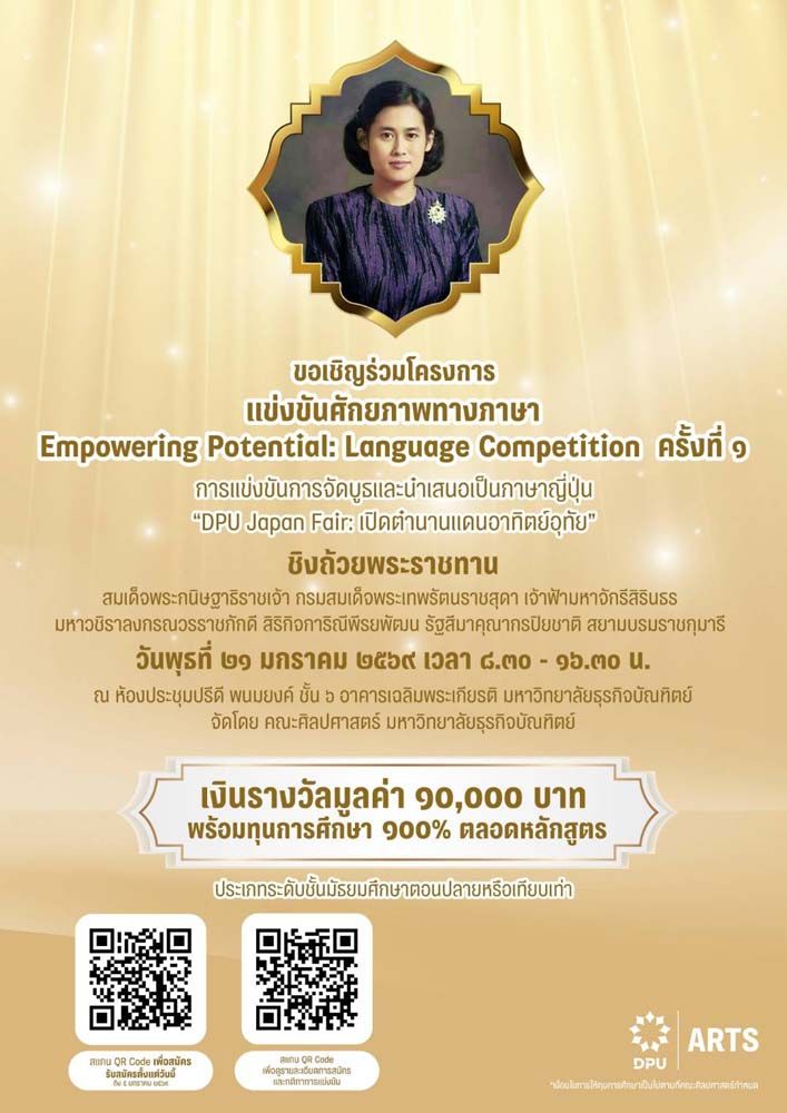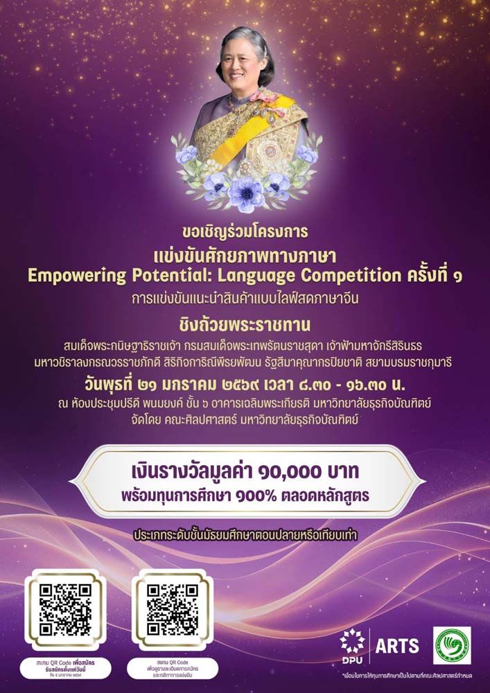 คณะศิลปศาสตร์ มหาวิทยาลัยธุรกิจบัณฑิตย์ (DPU) เปิดตัวโครงการการแข่งขันศักยภาพทางภาษา “Empowering Potential Language Communication” ครั้งที่ 1 ชิงถ้วยพระราชทานสมเด็จพระกนิษฐาธิราชเจ้า กรมสมเด็จพระเทพรัตนราชสุดาฯ สยามบรมราชกุมารี เปิดเวทีให้นักเรียนมัธยมปลายหรือเทียบเท่าทั่วประเทศได้แสดงศักยภาพด้านภาษา 4 ภาษา ทั้งภาษาจีน ภาษาอังกฤษ ภาษาญี่ปุ่น และภาษาเกาหลี ผ่านโจทย์การใช้ภาษาเชิงประยุกต์ ตั้งแต่ไลฟ์สดขายสินค้า ประกวดสุนทรพจน์ การแสดงบทบาทสมมุติ ไปจนถึงออกแบบบูธทางวัฒนธรรม โดยไม่มีค่าใช้จ่ายในการสมัคร พร้อมลุ้นทุนการศึกษาต่อที่ DPU