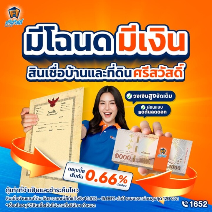 สอบถามข้อมูลเพิ่มเติมได้ที่ ศ.ศาลาสีส้ม ทุกสาขาใกล้บ้าน เปิดให้บริการกว่า 6,000 สาขาทั่วประเทศ หรือ www.sawad.co.th, LINE Official: @srisawad และ โทร. 1652 เพื่อรับคำปรึกษาฟรีแบบไม่มีค่าใช้จ่าย