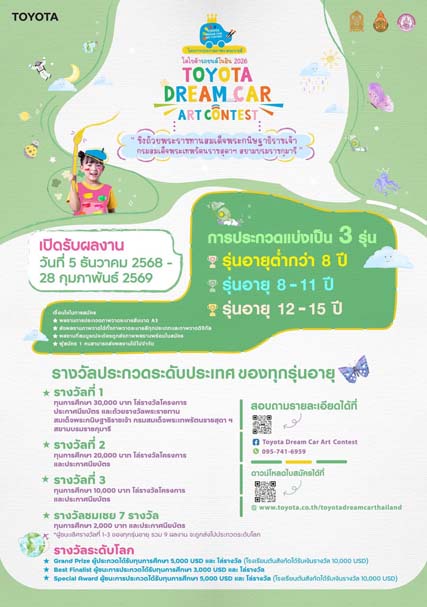 เปิดโครงการประกวดวาดภาพระบายสี “โตโยต้า รถยนต์ในฝัน” “TOYOTA Dream Car Art Contest 2026” ชิงถ้วยพระราชทาน สมเด็จพระกนิษฐาธิราชเจ้า กรมสมเด็จพระเทพรัตนราชสุดาฯ สยามบรมราชกุมารี