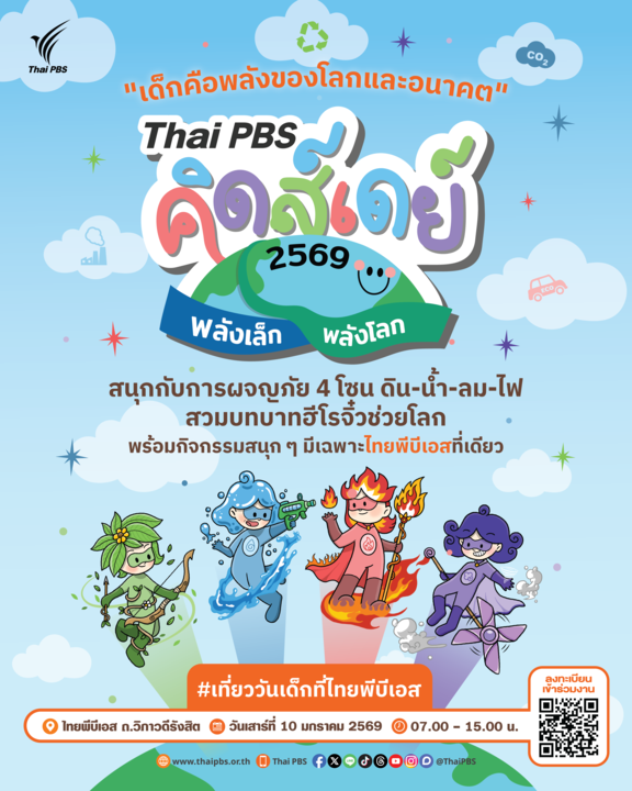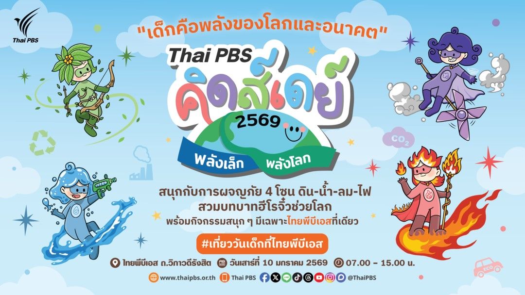 ไทยพีบีเอส เชิญชวนร่วมงาน “Thai PBS คิดส์เดย์ 2569 พลังเล็กพลังโลก” ในวันเสาร์ที่ 10 ม.ค. 69 เปิดพื้นที่แห่งจินตนาการและการผจญภัยให้เด็ก ๆ ได้สวมบทฮีโรจิ๋วพิทักษ์โลก ผ่านกิจกรรมสร้างสรรค์ความรู้ด้านสิ่งแวดล้อม และกิจกรรมที่ช่วยพัฒนาทักษะสมอง (EF) ส่งเสริมทักษะทางสังคม และเสริมสร้างความฉลาดทางอารมณ์