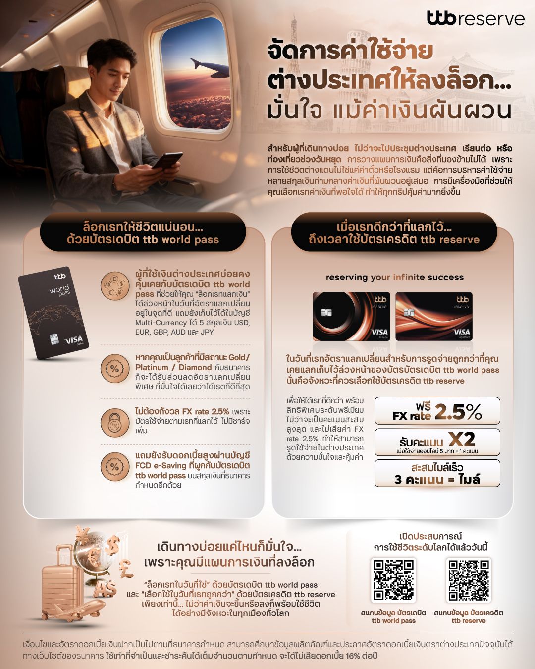 ทุกครั้งที่เก็บกระเป๋าออกเดินทาง อาจไม่ได้มีแค่พาสปอร์ตและตั๋วเครื่องบิน แต่ควรมี “แผนการเงินที่ดี” ร่วมทางเสมอ เพราะในวันที่ค่าเงินผันผวน คุณไม่จำเป็นต้องหยุดใช้ชีวิต เพียงแค่รู้จัก “ล็อกเรทในวันที่ใช่” ด้วยบัตรเดบิต ttb world pass และ “เลือกใช้ในวันที่เรทถูกกว่า” ด้วยบัตรเครดิต ttb reserve