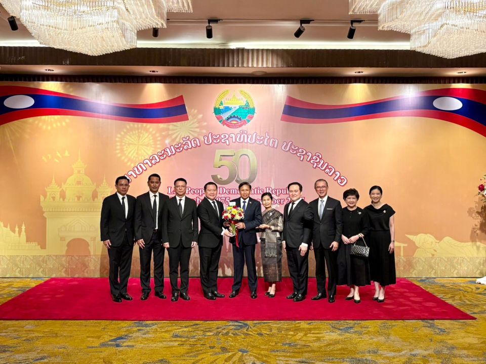 คุณฐาปน สิริวัฒนภักดี ประธานเจ้าหน้าที่บริหาร และ คุณปณต สิริวัฒนภักดี กรรมการ บริษัท ไทยเบฟเวอเรจ จำกัด (มหาชน) พร้อมด้วยคณะที่ปรึกษาและผู้บริหาร ร่วมงานงานเลี้ยงรับรองและแสดงความยินดีเนื่องในโอกาสเฉลิมฉลองครบรอบ 50 ปี การสถาปนาสาธารณรัฐประชาธิปไตยประชาชนลาว (วันชาติ สปป.ลาว) และครบรอบ 75 ปี ความสัมพันธ์ทางการทูตไทย - ลาว เมื่อวันอังคารที่ 9 ธันวาคม 2568 ณ แอทธินี ทาวเวอร์ กรุงเทพฯ โดยมี ฯพณฯ สีสะหวาด อินพะจัน (H.E. Mr. Sisavath Inphachanh) เอกอัครราชทูตสาธารณรัฐประชาธิปไตยประชาชนลาวประจำประเทศไทยให้การต้อนรับ ร่วมด้วยคณะทูตานุทูต ผู้แทนหน่วยงานภาครัฐและภาคเอกชน