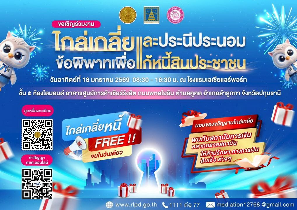 วันอาทิตย์ที่ 18 มกราคม 2569 สถานที่ โรงแรมเอเชีย แอร์พอร์ท ชั้น 5 ห้องไดมอนด์ อาคารศูนย์การค้าเชียร์รังสิต พบกับกิจกรรมเจรจาประนอมหนี้ ไกล่เกลี่ยข้อพิพาท , รับคำปรึกษากฎหมายจากผู้เชี่ยวชาญ , นิทรรศการให้ความรู้ด้านการเงิน