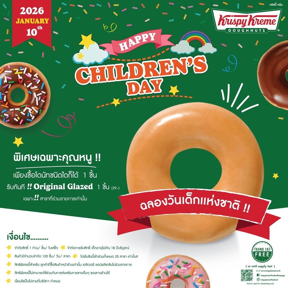 คริสปี้ ครีม ประเทศไทย โดนัทสูตรลิขสิทธิ์อันดับ 1 ที่ครองใจคนทั่วโลก ต้อนรับวันเด็กแห่งชาติปีนี้ ด้วย Happy Children’s Day มอบช่วงเวลาแห่งความสุขให้คุณหนูๆ ได้เพลิดเพลินกับความอร่อยของโดนัทเนื้อนุ่มในวันสุดพิเศษ เพียงซื้อโดนัทรสชาติใดก็ได้ 1 ชิ้น รับทันที!! โดนัทออริจินอล เกลซ 1 ชิ้น เฉพาะวันเสาร์ที่ 10 มกราคมนี้ ณ ร้านคริสปี้ ครีม 25 สาขาที่ร่วมรายการเท่านั้น! (จำกัด 120 สิทธิ์ต่อสาขา สำหรับเด็กที่มีอายุไม่เกิน 18 ปีบริบูรณ์ 1 คน/ชิ้น/ใบเสร็จ)