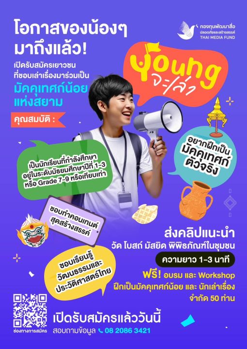 กองทุนพัฒนาสื่อปลอดภัยและสร้างสรรค์ (Thai Media Fund) จัดกิจกรรม “Young จะเล่า” โดยมีวัตถุประสงค์เพื่อพัฒนาศักยภาพเด็กและเยาวชนรุ่นใหม่ พร้อมเฟ้นหาและสร้าง “มัคคุเทศก์น้อยแห่งสยาม” นักเล่าเรื่องรุ่นใหม่ที่สามารถถ่ายทอดคุณค่าความงดงามของวัฒนธรรม ประวัติศาสตร์ และแหล่งท่องเที่ยวทางวัฒนธรรมของไทย ผ่านการสื่อสารและการผลิตสื่ออย่างปลอดภัยและสร้างสรรค์ โดยเปิดรับสมัครนักเรียนที่กำลังศึกษาอยู่ในระดับมัธยมศึกษา ปีที่ 1 - 3 หรือ Grade 7 - 9 หรือเทียบเท่า ที่มีความสนใจและชอบเล่าเรื่อง ทำคอนเทนต์ และสนใจวัฒนธรรมและประวัติศาสตร์ไทย ส่งผลงาน คลิปวิดีโอความยาว