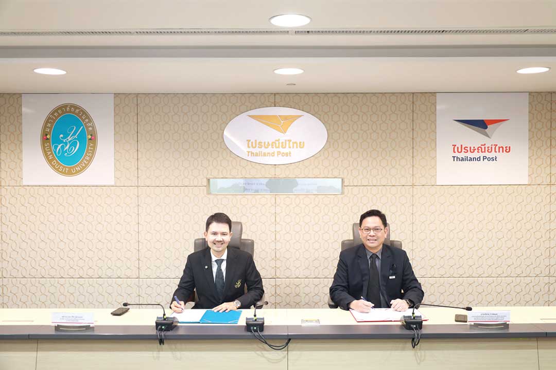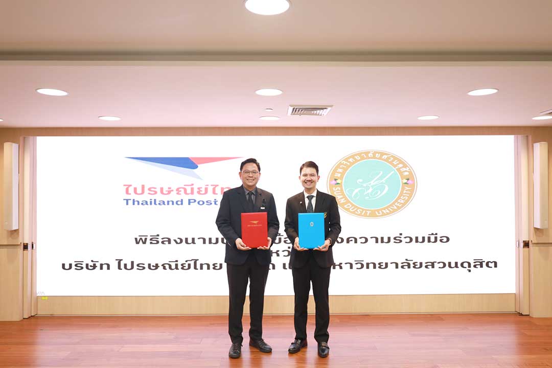 บริษัท ไปรษณีย์ไทย จำกัด และ มหาวิทยาลัยสวนดุสิต จัดพิธีลงนามบันทึกข้อตกลงความร่วมมือทางวิชาการ เพื่อขับเคลื่อนโครงการวิจัยและพัฒนาระบบตลาดออนไลน์และการขนส่งสินค้าเกษตร หวังสร้างต้นแบบเศรษฐกิจชุมชนที่ยั่งยืน โดยได้รับเกียรติจาก รองศาสตราจารย์ ดร.ชนะศึก นิชานนท์ รองอธิการบดีฝ่ายบริหาร วิจัยและนวัตกรรม มหาวิทยาลัยสวนดุสิต และคุณพิษณุ วานิชผล ประธานเจ้าหน้าที่บริหารสายงานพัฒนาประสิทธิภาพองค์กร และรักษาการประธานเจ้าหน้าที่บริหารสายงานกลยุทธ์และการขับเคลื่อนองค์กร ลงนามความร่วมมือ โดยการลงนามความร่วมมือมีวัตถุประสงค์เพื่อร่วมมือกันศึกษา วิจัยและพัฒนาโครงการวิจัยเพื่อพัฒนาองค์ความรู้ด้านเทคโนโลยืออนไลน์มาร์เก็ตเพลสและการขนส่งสินค้ากุ้งก้ามกรามมีชีวิตผ่านกระบวนการขนส่งของ ปณท ให้มีความเหมาะสมกับสินค้าและประสิทธิภาพของของผู้บริโภค รวมถึงส่งเสริมการสร้างระบบนิเวศที่เอื้อต่อการพัฒนามาร์เก็ตเพลสออนไลน์ในการดำเนินธุรกิจผู้ประกอบการ และส่งเสริมเศรษฐกิจชุมชนที่ยั่งยืน