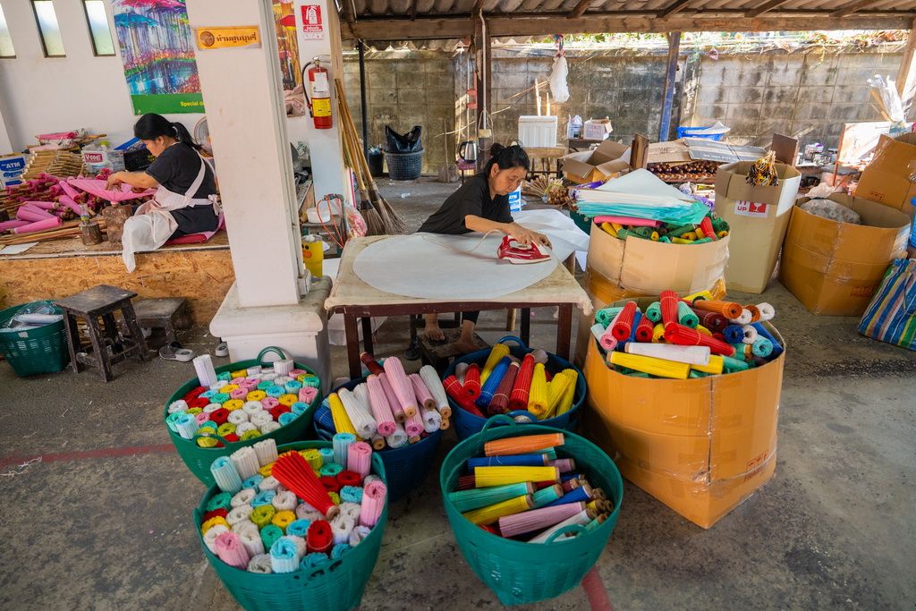 เดินทางเยี่ยมชมและทํากิจกรรม Workshop ระบายสีร่มที่ โหม้งต้นเปา ศูนย์สาธิตการทําร่มกระดาษสาตามแบบภูมิปัญญาดั้งเดิม แหล่งผลิตที่มีชื่อเสียงและสืบทอดองค์ความรู้ท้องถิ่นมาอย่างยาวนาน ภายในโหม้งเปิดให้สัมผัสทุกขั้นตอนการผลิตอย่างใกล้ชิด ตั้งแต่การเตรียมไม้ไผ่ การขึ้นโครงร่ม การขึงกระดาษสาที่ประณีต ไปจนถึงการแต่งแต้มลวดลายด้วยมือ เปิดโอกาสให้ผู้มาเยือนได้ถ่ายทอดจินตนาการลงบนชิ้นงานที่เป็นเอกลักษณ์หนึ่งเดียว