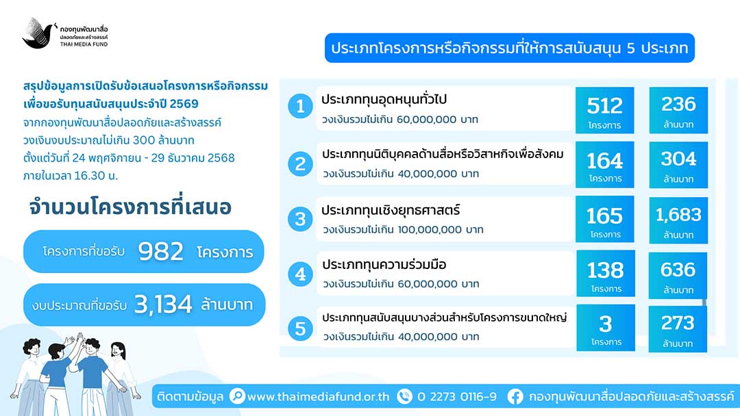 และรับทราบเรื่องการรายงานความคืบหน้าการเปิดรับโครงการหรือกิจกรรมที่ขอรับการสนับสนุนเงินจากกองทุนพัฒนาสื่อปลอดภัยและสร้างสรรค์ ประจำปี 2569 วงเงินงบประมาณ 300 ล้านบาท โดยมีจำนวนโครงการฯ ที่ยื่นเสนอ จำนวน 982 โครงการ งบประมาณที่ขอรับรวม 3,134 ล้านบาท แบ่งเป็น 5 ประเภท