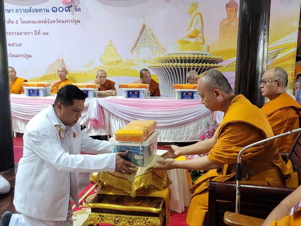 ในวันนี้คณะศิษยานุศิษย์พระมงคลเทพมุนี ได้อาราธนาพระสังฆาธิการจาก 109 วัด มารับถวายมหาสังฆทานเพื่อบำรุงวัดวาอารามตามเส้นทางมหาปูชนียาจารย์ในเขตจังหวัดนครปฐม โดยได้รับความเมตตาจาก พระเดชพระคุณพระศรีวิสุทธิวงศ์ รองเจ้าคณะจังหวัดนครปฐม ผู้ช่วยเจ้าอาวาสวัดพระปฐมเจดีย์ราชวรมหาวิหาร เป็นประธานสงฆ์ นายธนัชพงศ์ สุนทรทิพยกิตติ์ รองผู้อำนวยการสำนักงานเขตพื้นที่การศึกษานครปฐม เขต 2 เป็นประธานฝ่ายฆราวาส