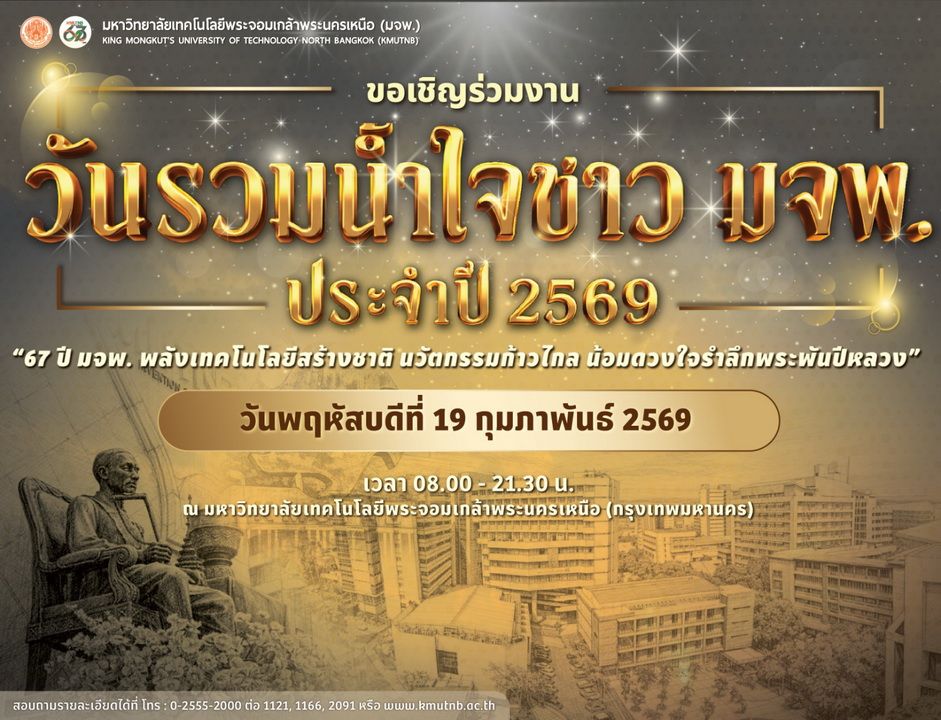 มจพ. ขอเชิญชวนคณาจารย์ บุคลากร ศิษย์เก่า ศิษย์ปัจจุบัน ผู้เกษียณอายุราชการ แขกผู้มีเกียรติ เครือข่ายความร่วมมือทางวิชาการ ร่วมงานวันรวมน้ำใจชาว มจพ. ประจำปี 2569 “67 ปี มจพ. พลังเทคโนโลยีสร้างชาติ นวัตกรรมก้าวไกล น้อมดวงใจรำลึกพระพันปีหลวง” ในวันพฤหัสบดีที่ 19 กุมภาพันธ์ 2569 เวลา 08.00-21.30 น. ณ มหาวิทยาลัยเทคโนโลยีพระจอมเกล้าพระนครเหนือ กรุงเทพฯ