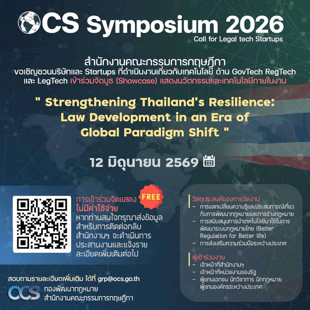 สำนักงานคณะกรรมการกฤษฎีกาขอเชิญชวนผู้ประกอบการและสตาร์ตอัปที่สนใจ เข้าร่วมเป็นส่วนหนึ่งของงาน OCS Symposium 2026 เพื่อร่วมแลกเปลี่ยนมุมมอง จัดแสดงนวัตกรรมและบริการ รวมถึงมีส่วนร่วมในการช่วยพัฒนาระบบกฎหมายและการกำกับดูแลภาครัฐของไทยให้พร้อมรับความเปลี่ยนแปลงในอนาคต โดยผู้ที่สนใจสามารถแสดงความประสงค์ได้ตาม QR Code ด้านล่างนี้ หรือติดต่อสอบถามข้อมูลเพิ่มเติมได้ที่อีเมล grp@ocs.go.th
