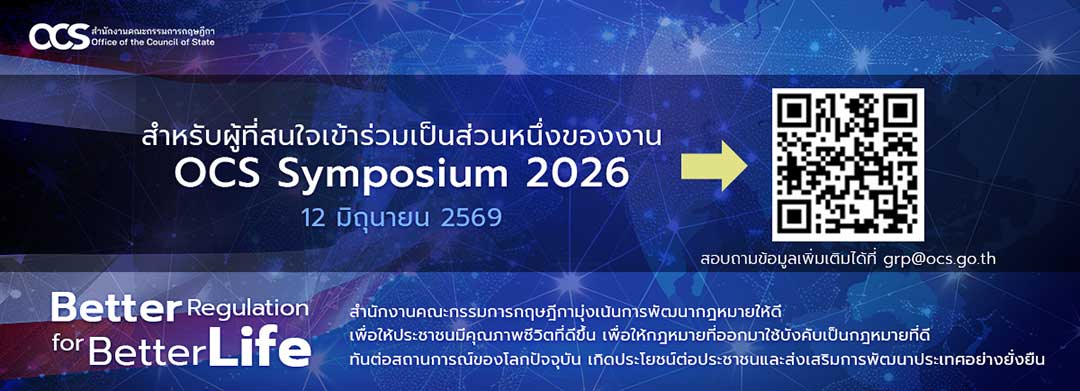 โดยงาน OCS Symposium ประจำปี 2026 มีกำหนดจัดขึ้นในวันที่ 12 มิถุนายน 2569 ภายใต้หัวข้อ “Strengthening Thailand’s Resilience: Law Development in an Era of Global Paradigm Shift” ซึ่งเป็นเวทีการสัมมนาที่ต่อยอดจากการจัดงานในปีก่อน ที่มุ่งเน้นการแลกเปลี่ยนองค์ความรู้ ความเข้าใจ รวมถึงการยกระดับคุณภาพการจัดทำกฎหมายและการกำกับดูแลให้สอดคล้องกับหลักสากล โดยในปีนี้ สำนักงานฯ ได้ขยายกรอบของงานประชุมให้ครอบคลุมประเด็นอื่น ๆ ที่เกี่ยวข้องกับระบบกฎหมายและการบังคับใช้กฎหมายเพื่อให้มีความพร้อมรับมือกับการเปลี่ยนแปลงที่เกิดขึ้นในบริบทของประเทศไทยและของโลก ทั้งในด้านนโยบาย เศรษฐกิจ เทคโนโลยี และการกำกับดูแลภาครัฐ