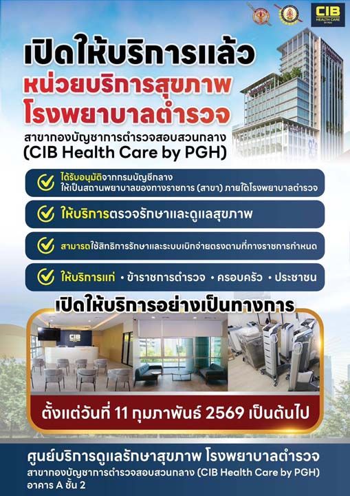 28 มกราคม 2569 ที่ รพ.ตร. พล.ต.ท.ไพบูลย์ เจียมอนุกูลกิจ รักษาราชการแทนนายแพทย์ใหญ่ (สบ 8) โรงพยาบาลตำรวจ เปิดเผยว่า จากนโยบายและข้อสั่งการของ พล.ต.อ.กิตติ์รัฐ พันธุ์เพ็ชร์ ผบ.ตร.และ พล.ต.อ.กรไชย คล้ายคลึง รอง ผบ.ตร.(บร.)ให้โรงพยาบาลตำรวจเปิดให้บริการ ศูนย์บริการดูแลรักษาสุขภาพ โรงพยาบาลตำรวจ สาขากองบัญชาการตำรวจสอบสวนกลาง (CIB Health Care by PGH) อย่างเป็นทางการแล้ว เพื่อรองรับการดูแลสุขภาพของข้าราชการตำรวจ ครอบครัว และประชาชนทั่วไป สำหรับศูนย์บริการดังกล่าว เปิดให้บริการอย่างเป็นทางการตั้งแต่วันที่ 11 กุมภาพันธ์ 2569 เป็นต้นไป ณ อาคาร A ชั้น 2 กองบัญชาการตำรวจสอบสวนกลาง