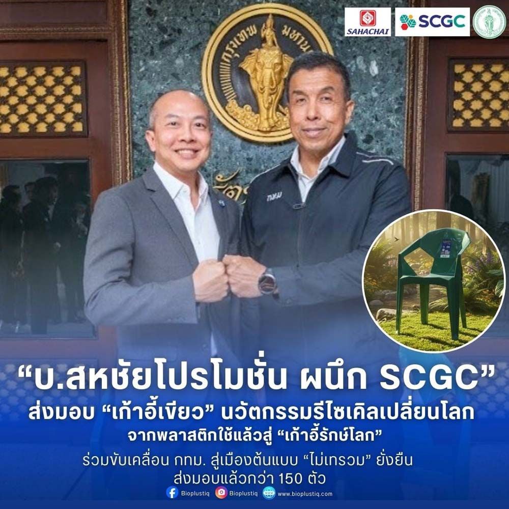 “ที่ ห้องรัตนโกสินทร์ ศาลาว่าการกรุงเทพมหานคร เขตพระนคร กรุงเทพมหานคร (เสาชิงช้า) นายแสงชัย จิตบุญทวีสุข ประธานเจ้าหน้าที่บริหาร บริษัท สหชัยโปรโมชั่น จำกัด ผู้นำในการพัฒนาผลิตภัณฑ์อุตสาหกรรมรักษ์โลกภายใต้แบรนด์น้องใหม่ “Bioplustiq” ที่เติบโตควบคู่ความยั่งยืน พร้อมด้วย นายชาตรี เอี่ยมโสภณา ประธานเจ้าหน้าที่สายงานพาณิชย์ บริษัท เอสซีจี เคมิคอลส์ จำกัด (มหาชน) (SCGC) ร่วมส่งมอบ “เก้าอี้รักษ์โลก” นวัตกรรมรีไซเคิลที่ผลิตขึ้นจากบรรจุภัณฑ์พลาสติกที่ใช้แล้ว จำนวน 150 ตัว ให้กับกรุงเทพมหานคร ภายใต้โครงการ ‘ไม่เทรวม’ โดยมี นายชัชชาติ สิทธิพันธุ์ ผู้ว่าราชการกรุงเทพมหานคร เป็นผู้รับมอบ เพื่อนำไปใช้ในพระราชพิธีและกิจกรรมสาธารณะประโยชน์ของกรุงเทพมหานครต่อไป”